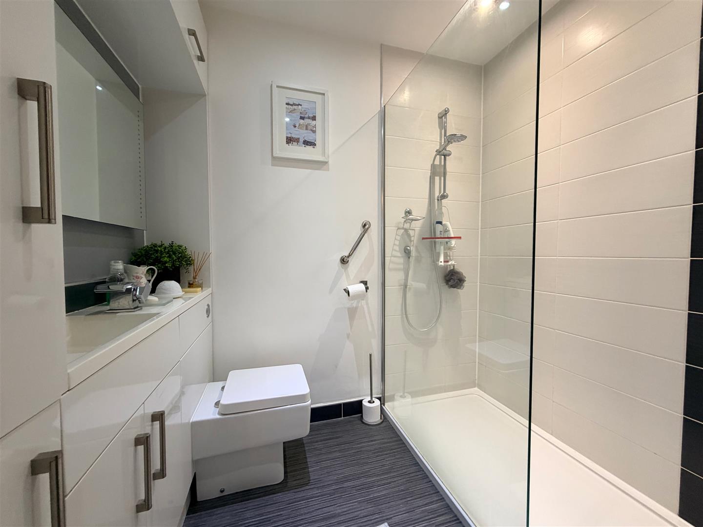 Comprising a large walk-in tiled shower with a fixed glass screen and wall-mounted controls and a range of cabinets featuring a sink and wc with a concealed cistern and a push-button flush. Wall-mounted mirror with integral lighting. Wall-mounted chrome towel rail/radiator. Inset ceiling spotlights.