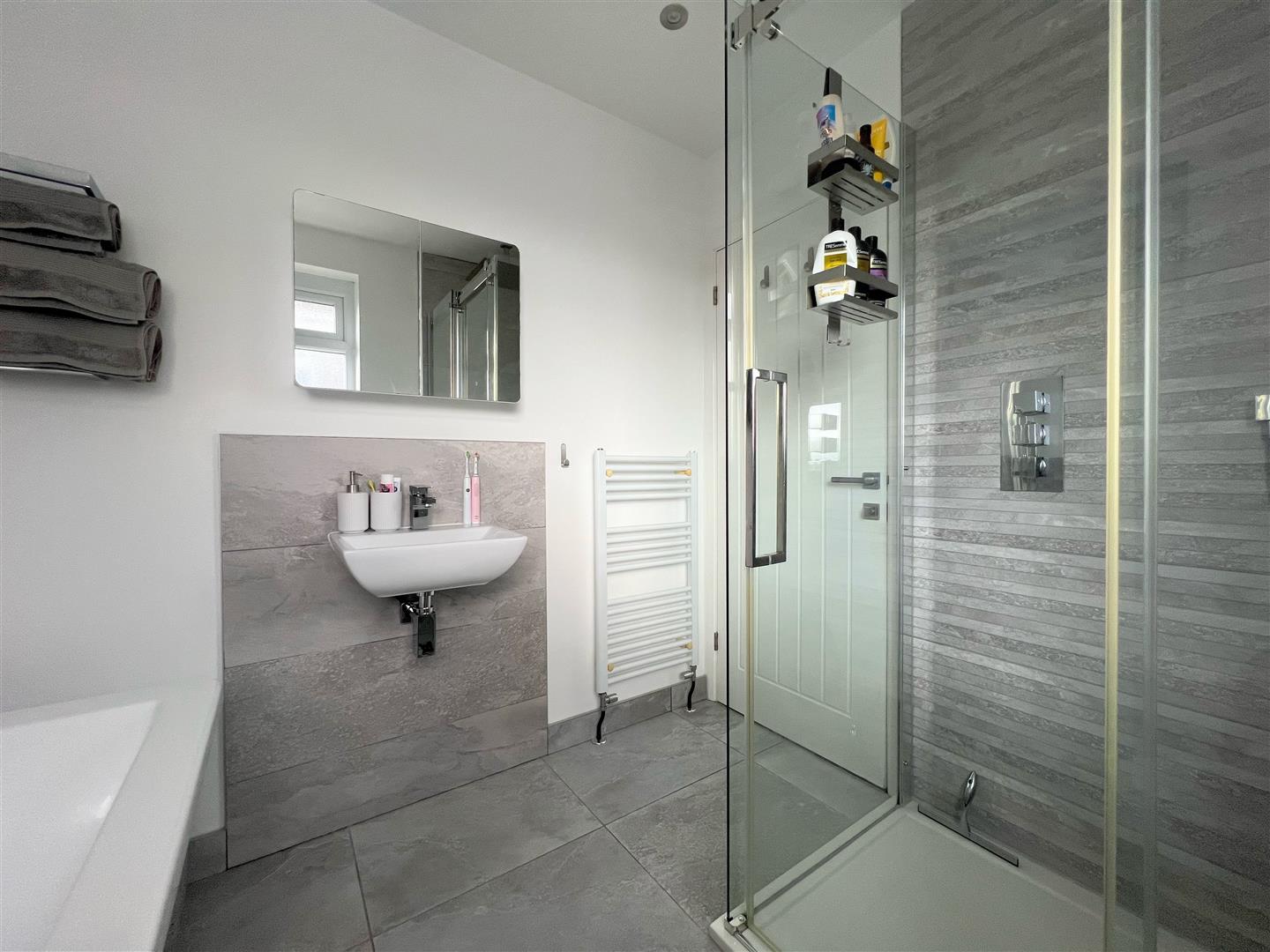 Comprising a semi free-standing square-edged bath, shower cubicle with a mains-fed shower and a monsoon shower head, close-coupled wc and a matching wall-mounted hand basin with mixer tap. Obscured uPVC double-glazed window to the side elevation.