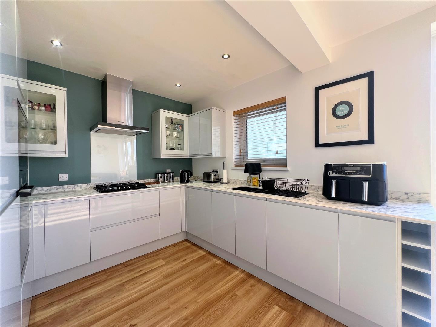 Fitted with a range of matching high-gloss base and wall-mounted units incorporating a composite marble-effect square-edged worktop. Inset one-&-a-half bowl sink with mixer tap. 4-burner gas hob with a wall-mounted extractor hood over. Integrated fridge-freezer, washing machine, dishwasher, microwave and an electric pyrolytic oven. Karndean flooring. uPVC double-glazed window to the rear looking into the lean-to/storage room. uPVC double-glazed patio doors overlooking and leading out to the rear garden.