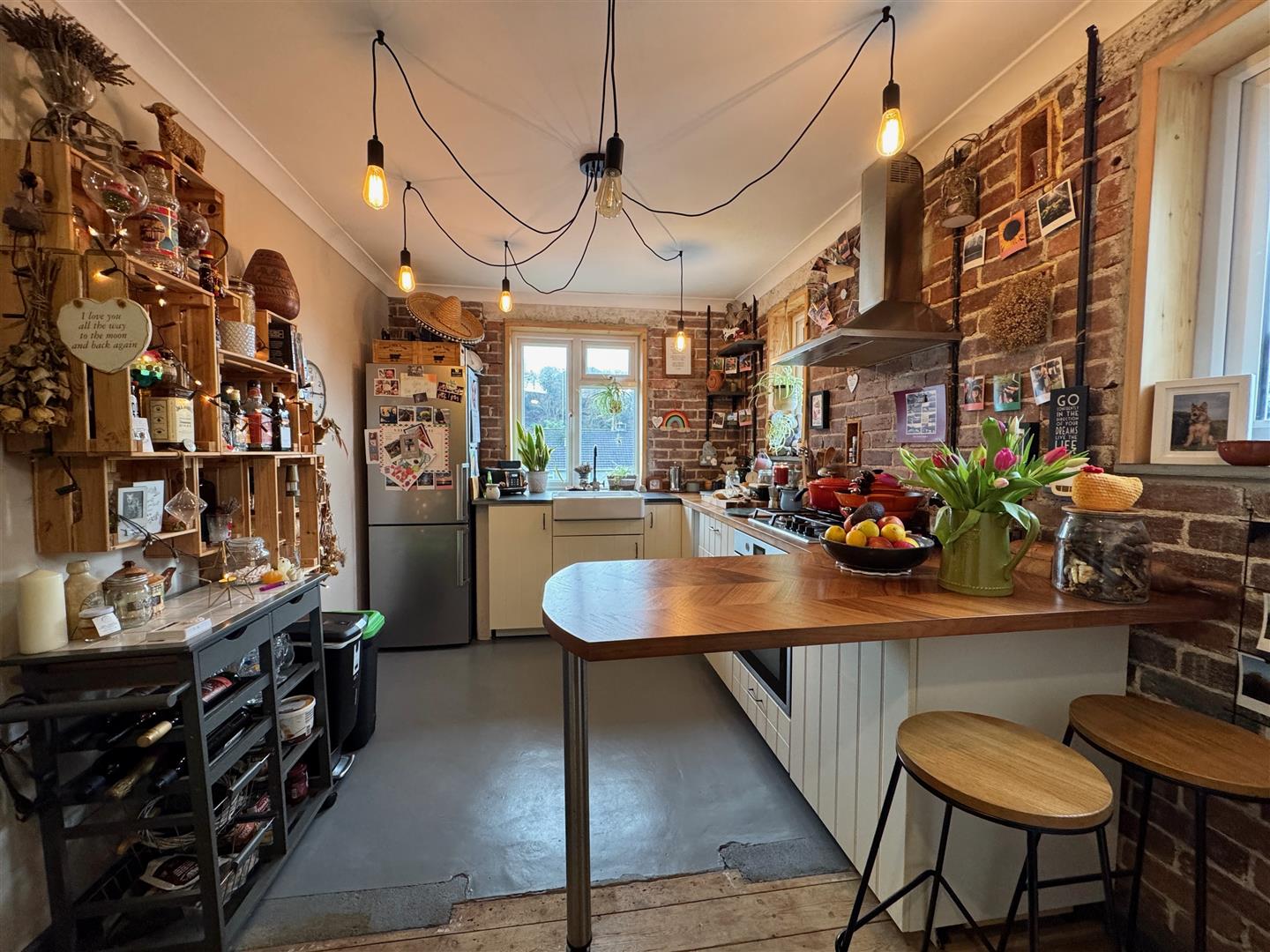 Matching base units with integrated oven. Space for an upright fridge/freezer. Work surfaces with inset ceramic sink unit, mixer tap & 4 ring gas hob with stainless steel hood over. Exposed brick work running along 2 walls. Access hatch to roof void. Door opens into the lounge.