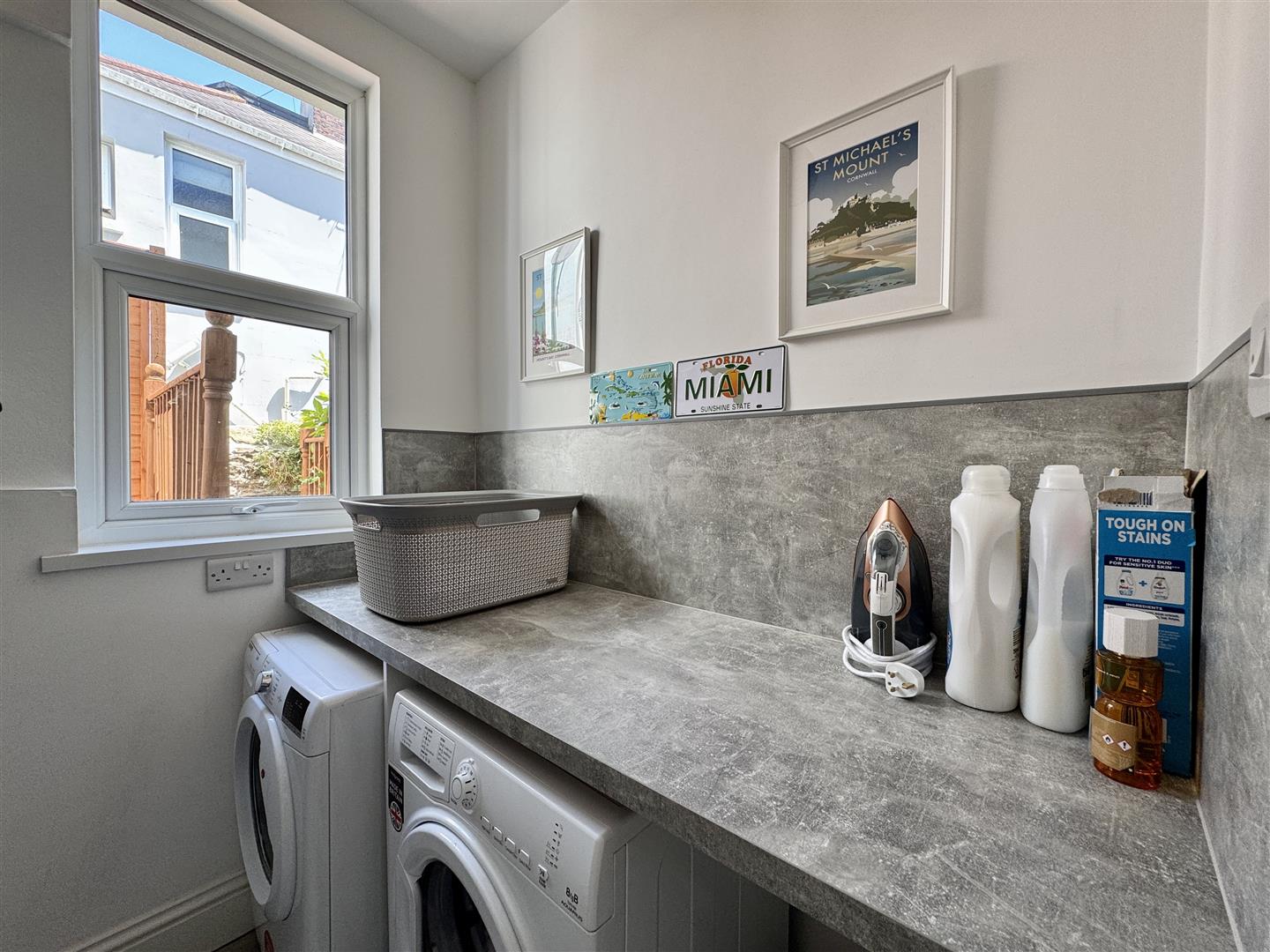Roll edge laminate work surface has space under for washing machine & tumble dryer. uPVC double-glazed window to the side. Wall mounted Worcester boiler. Grey wood effect laminate flooring.
