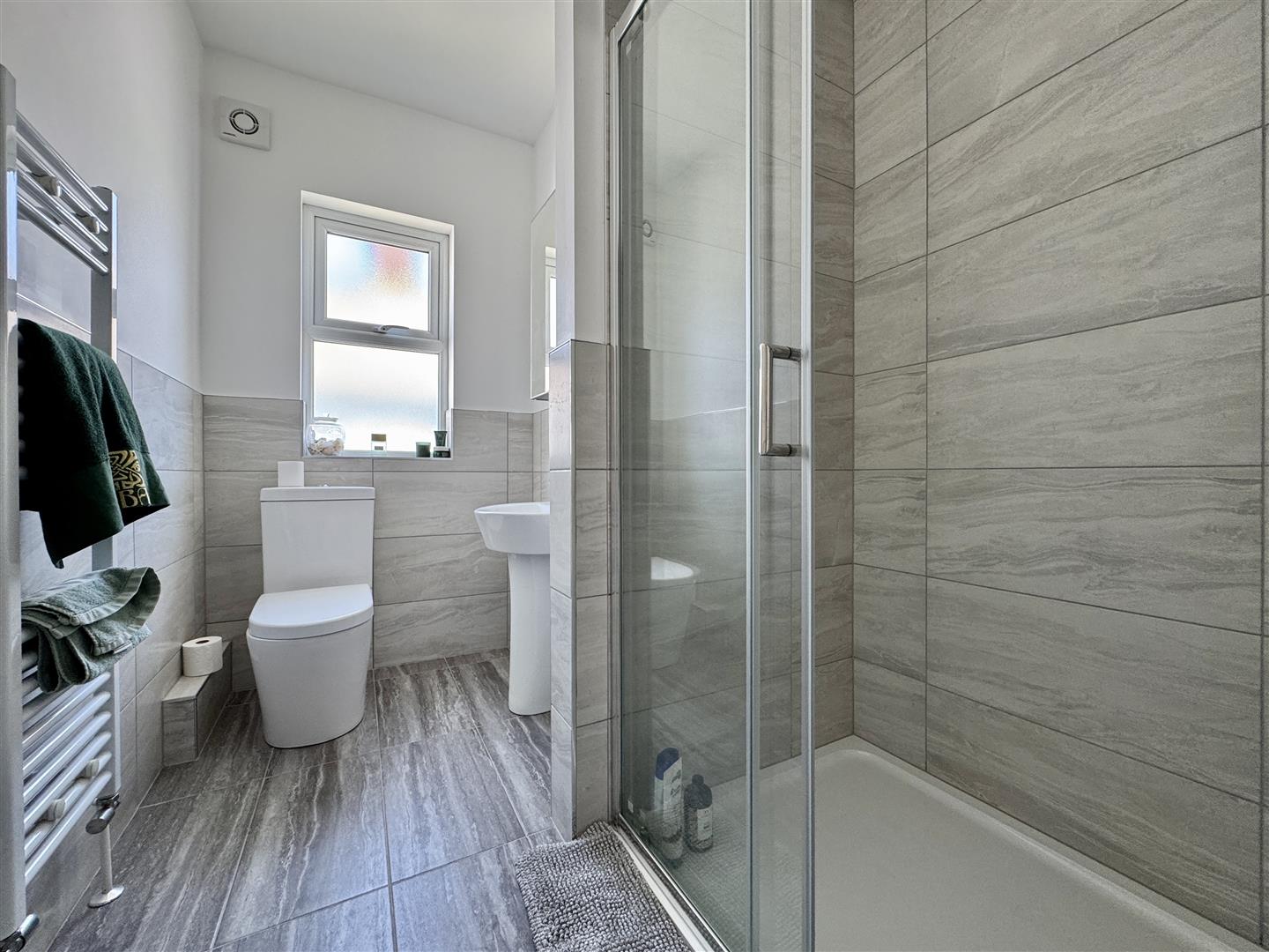 Matching suite of close coupled wc. Wall mounted wash hand basin. Tiled walls. Chrome heated towel rail. Obscured uPVC double-glazed window to the side. Tiled floor.