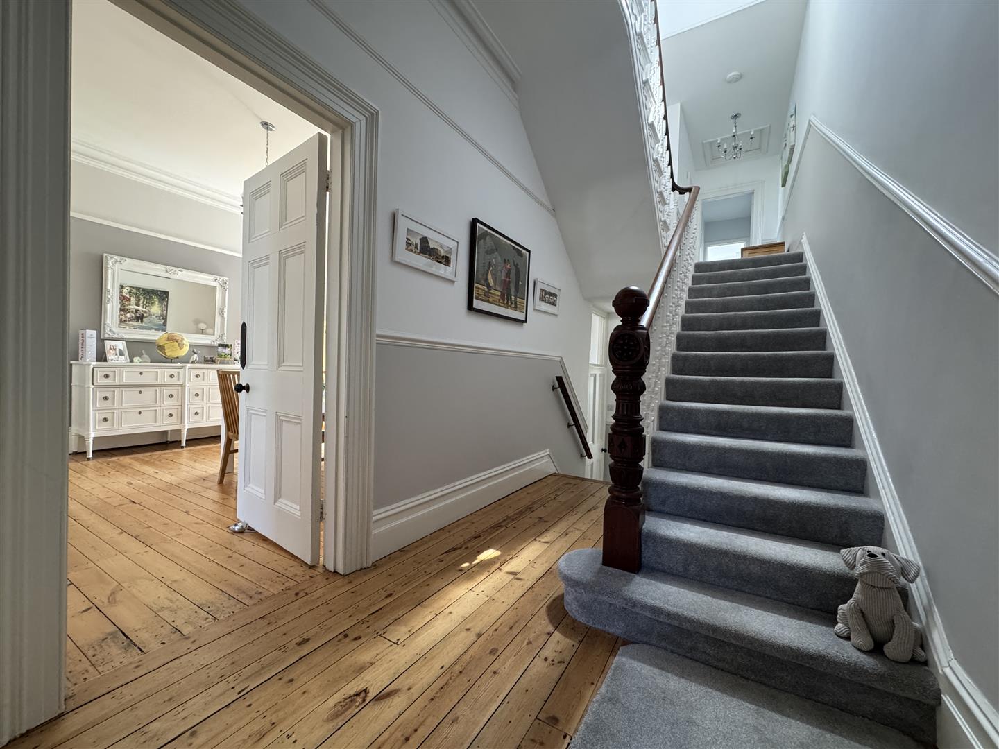 Exposed wooden floor boards. Covings. Dado rail. Doors leading to the lounge & dining room. Staircase leading to the half landing & first floor, also descending down to the inner hallway. Picture rail.