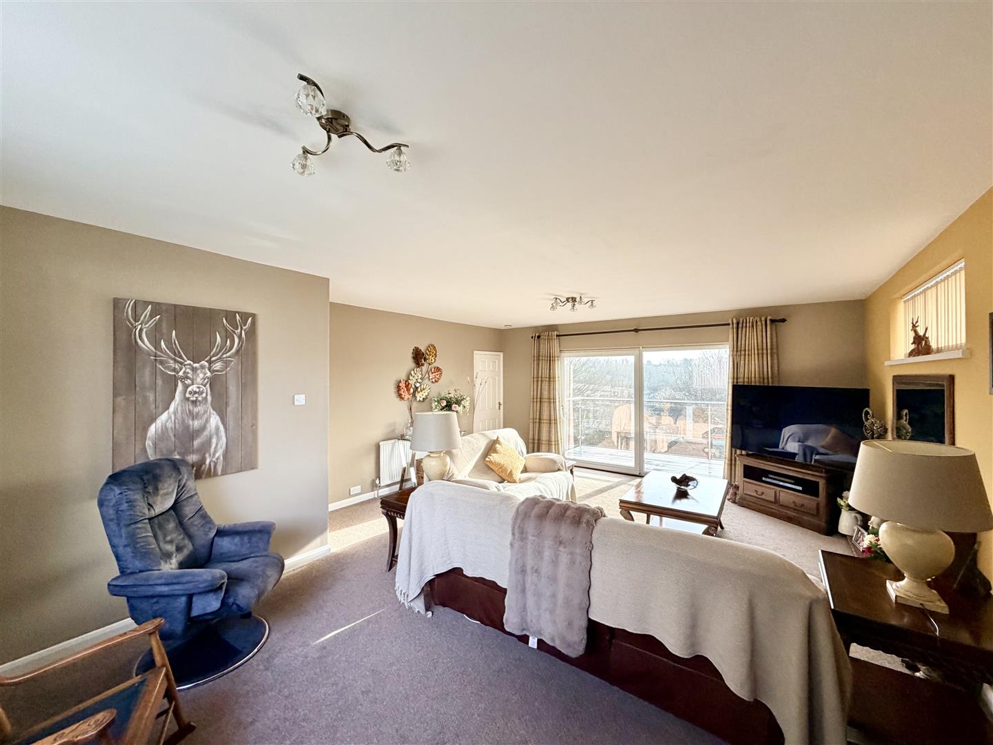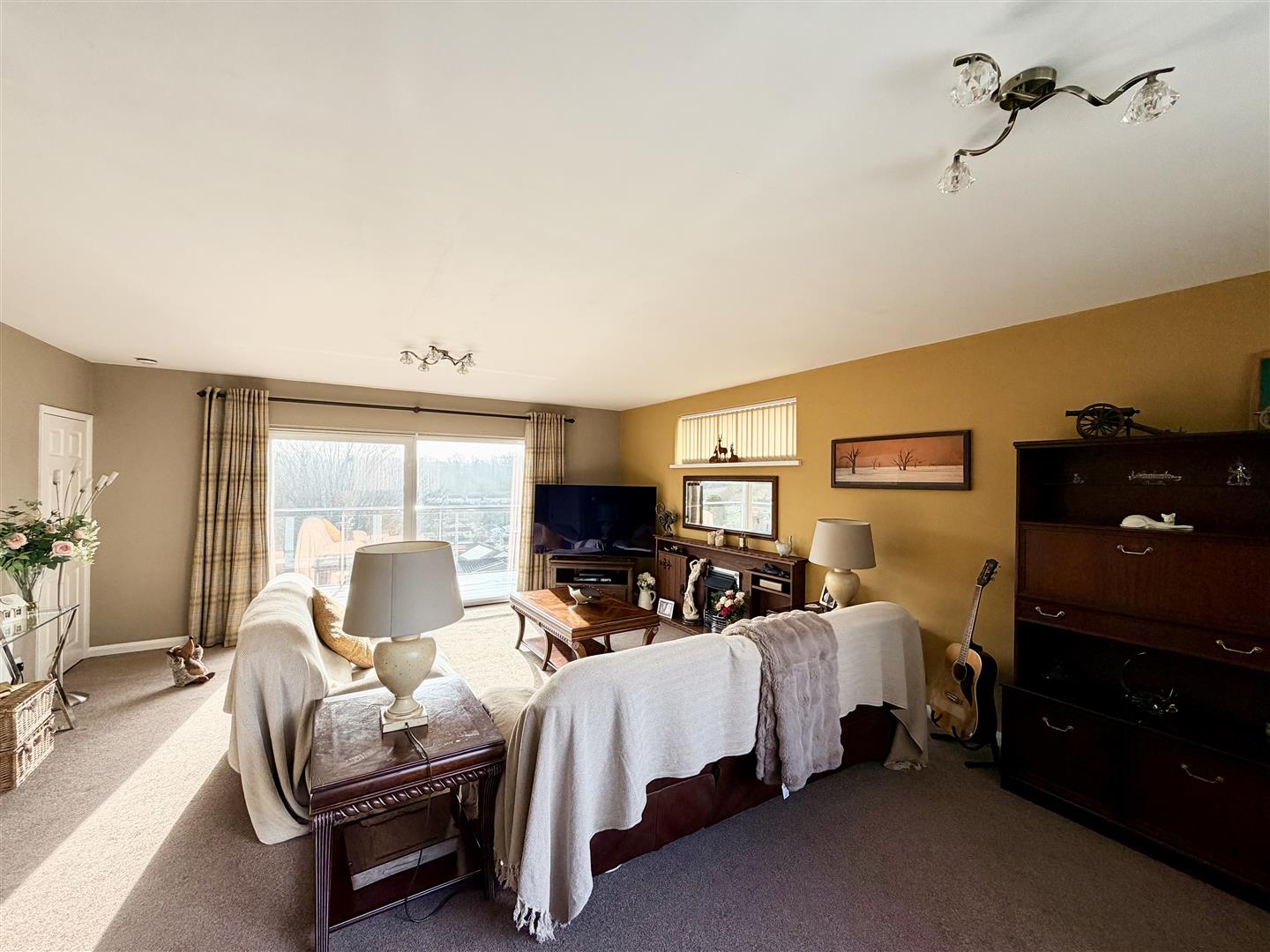 Feature electric fireplace set into a bespoke wooden hearth with surround and mantel. uPVC double-glazed sliding patio doors to the front elevation leading onto a balcony. The room is dual aspect with uPVC double-glazed windows to the front and side elevations.