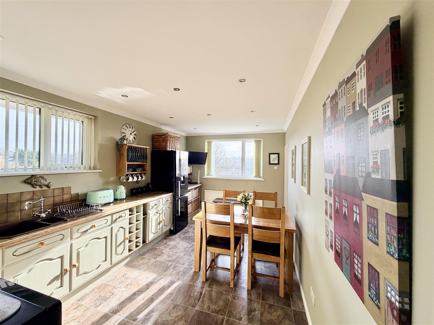 Fitted with a range of matching base and wall-mounted units with an inset one-&-a-half bowl stainless-steel sink with mixer tap. Spaces for a washing machine and tumble dryer. Boiler. Door leading to the gym. Obscured uPVC double-glazed door to the side providing access to the gardens. uPVC double-glazed window to the side elevation.