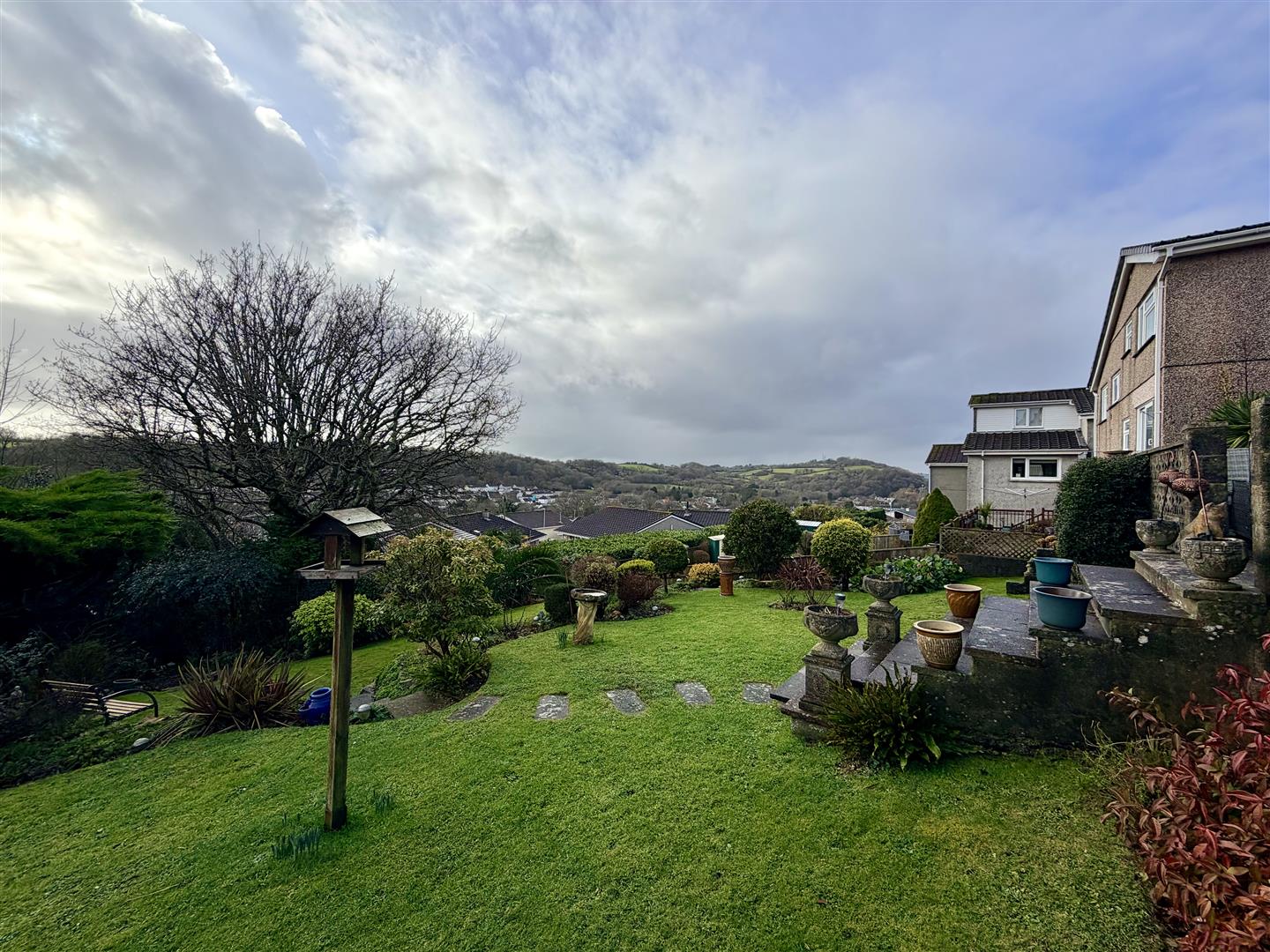 Doors opening to the lounge, kitchen/diner and wc. Stairs descending to the lower ground floor. uPVC double-glazed window to the side elevation overlooking the garden, with views out over Plymouth.