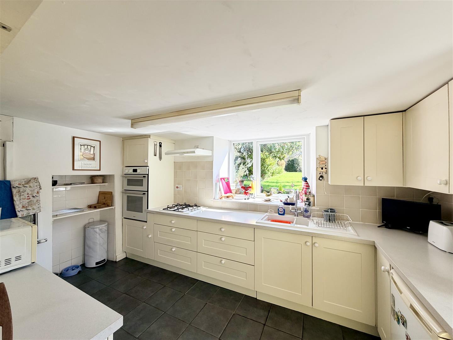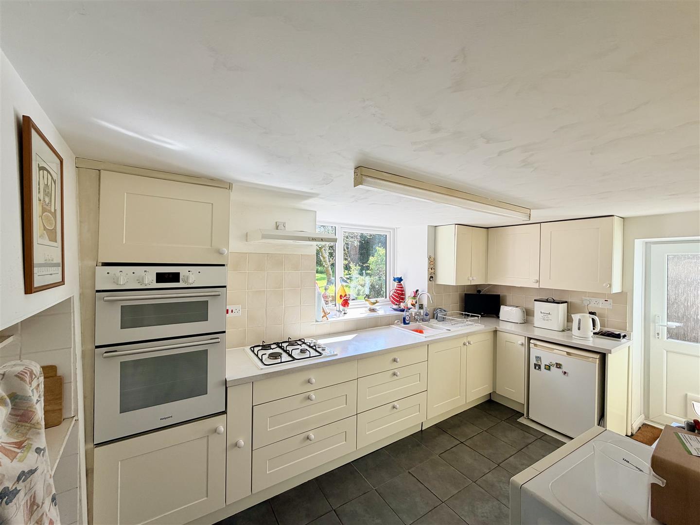 Matching base & wall mounted units to include a fitted twin oven. Space for an under-counter fridge. Roll edge laminate work surface has inset 1.5 bowl ceramic sink unit with mixer tap. Tiled splash-back. Inset 4 ring gas hob with a filter hood above. uPVC double-glazed box bay window to the rear overlooking the garden. Obscured uPVC double-glazed door opens to the side & out to the garden. Tiled floor with a sump. Room opens to the inner hall.
