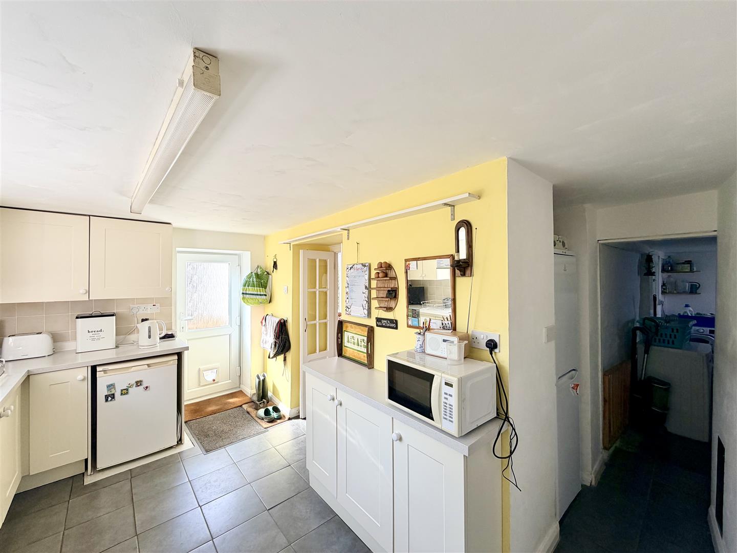The recess currently acts as a space for the fridge/freezer. Square arch opens into the utility room.