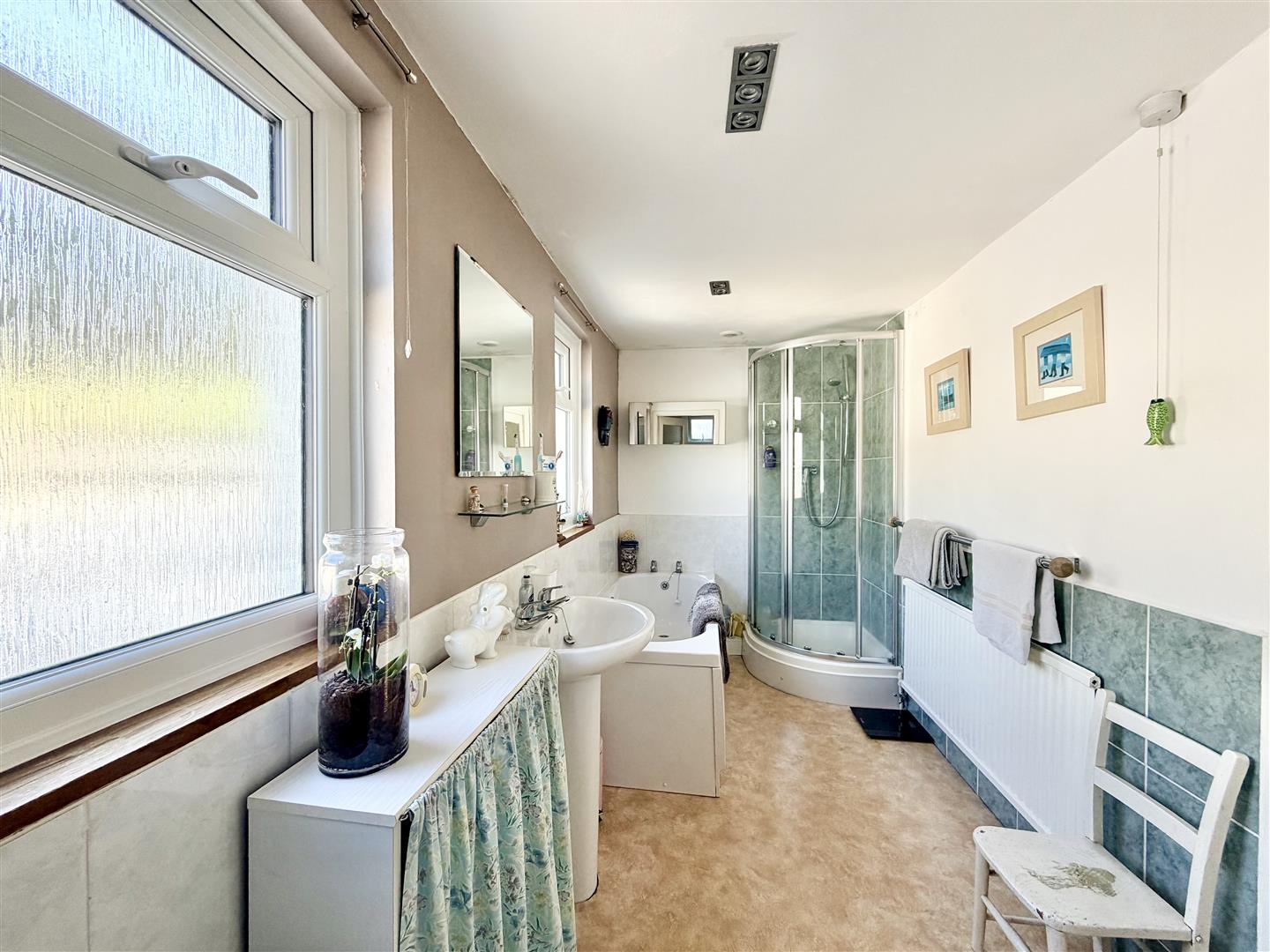 Matching suite of panelled bath & separate shower cubical with fitted shower & pedestal wash hand basin. Part-tiled walls. Ceiling spotlights. Two obscured uPVC double-glazed windows to the side. Wooden door with obscured glazed panels opens into the wc.