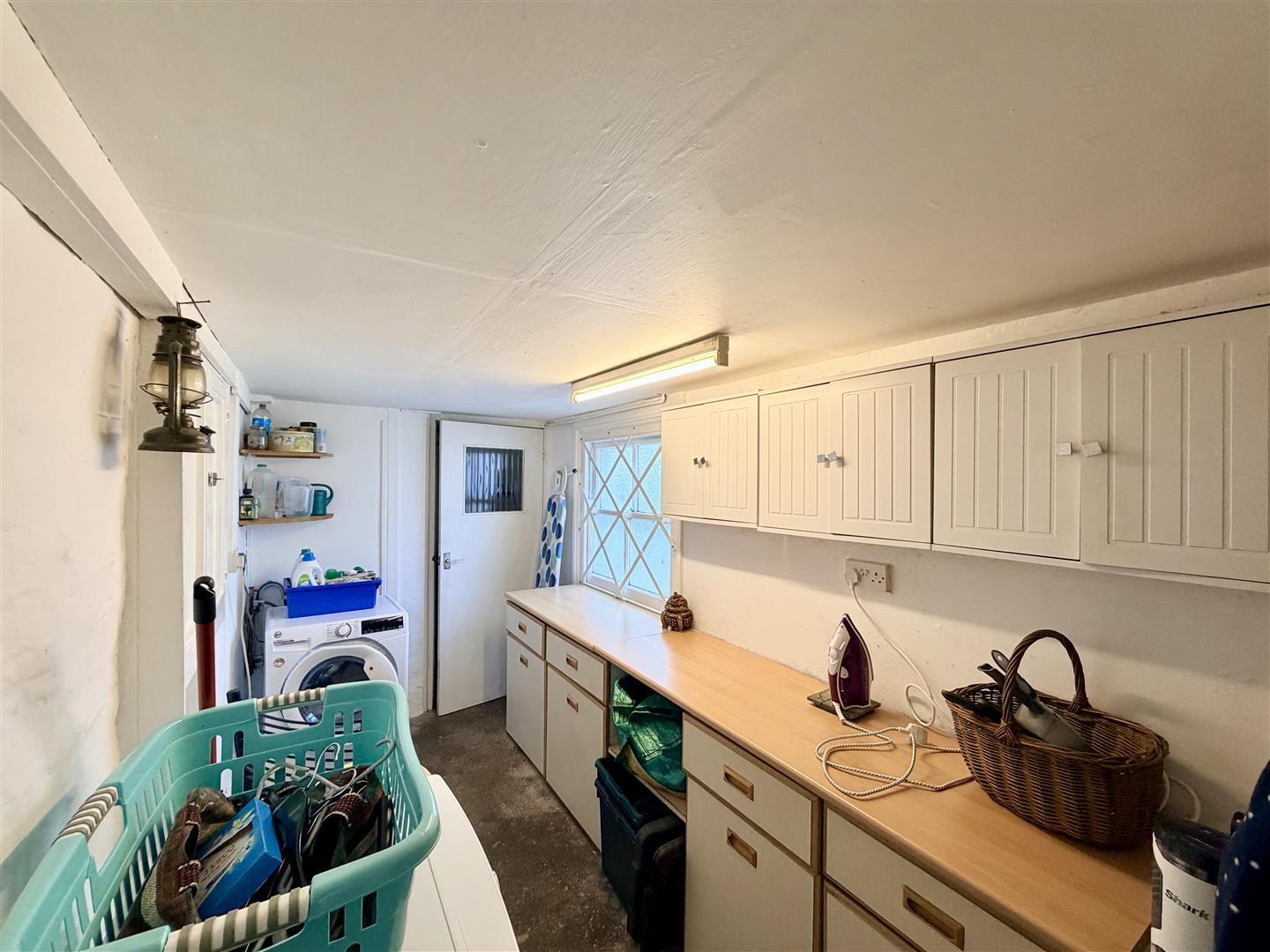 Base & wall mounted units positioned for a washing machine & tumble dryer. Obscured single-glazed sash style window to the side. Wooden door with obscured glazed panel opens into the wc.