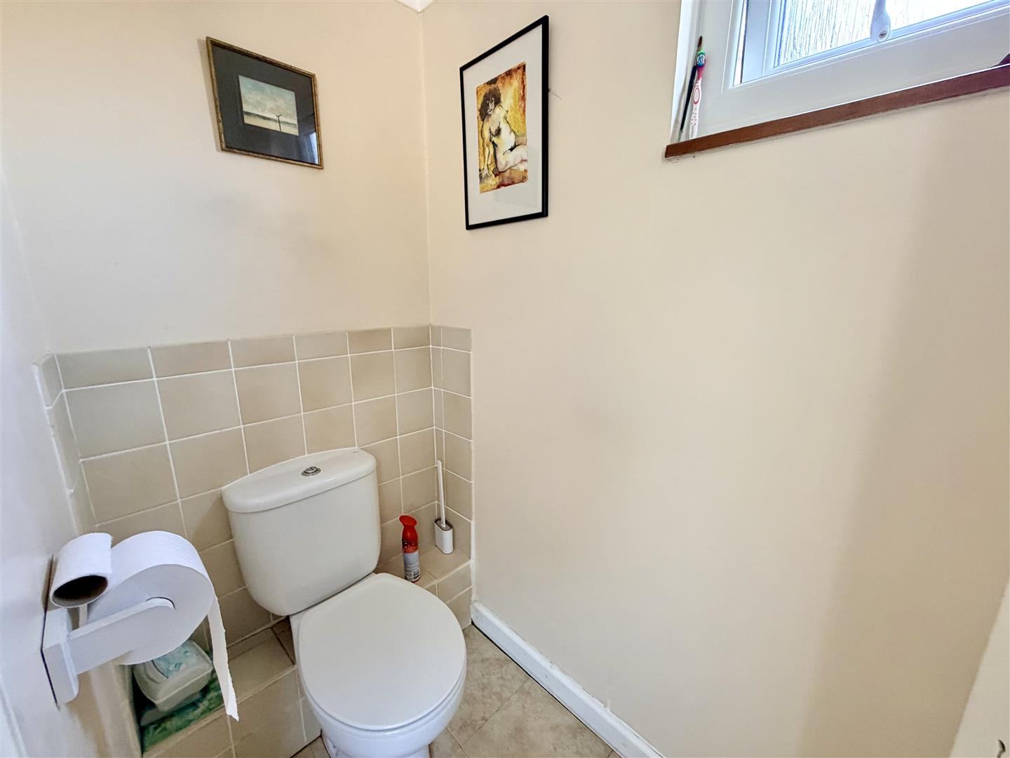 Close coupled wc. Obscured uPVC double-glazed window to the front.