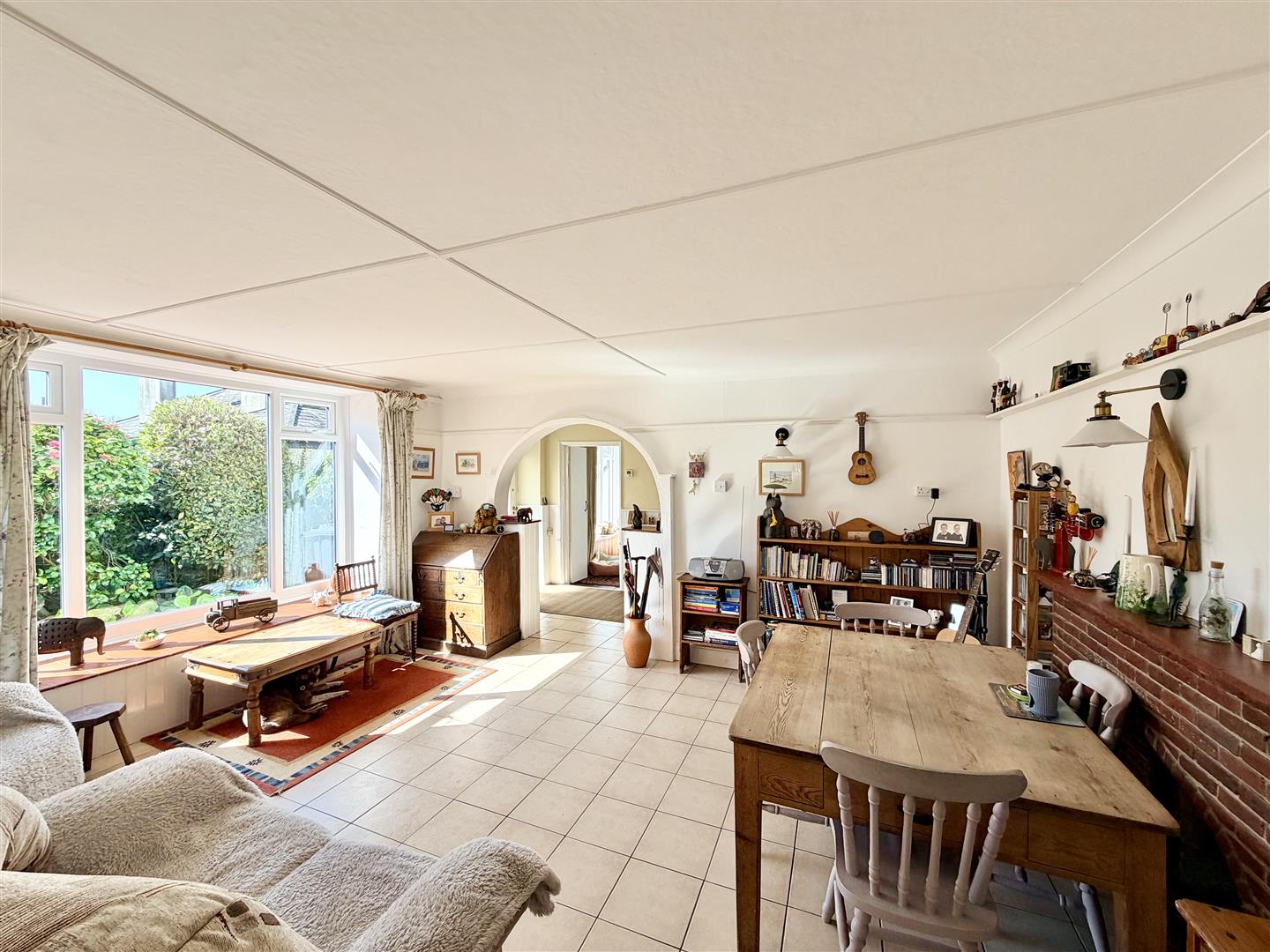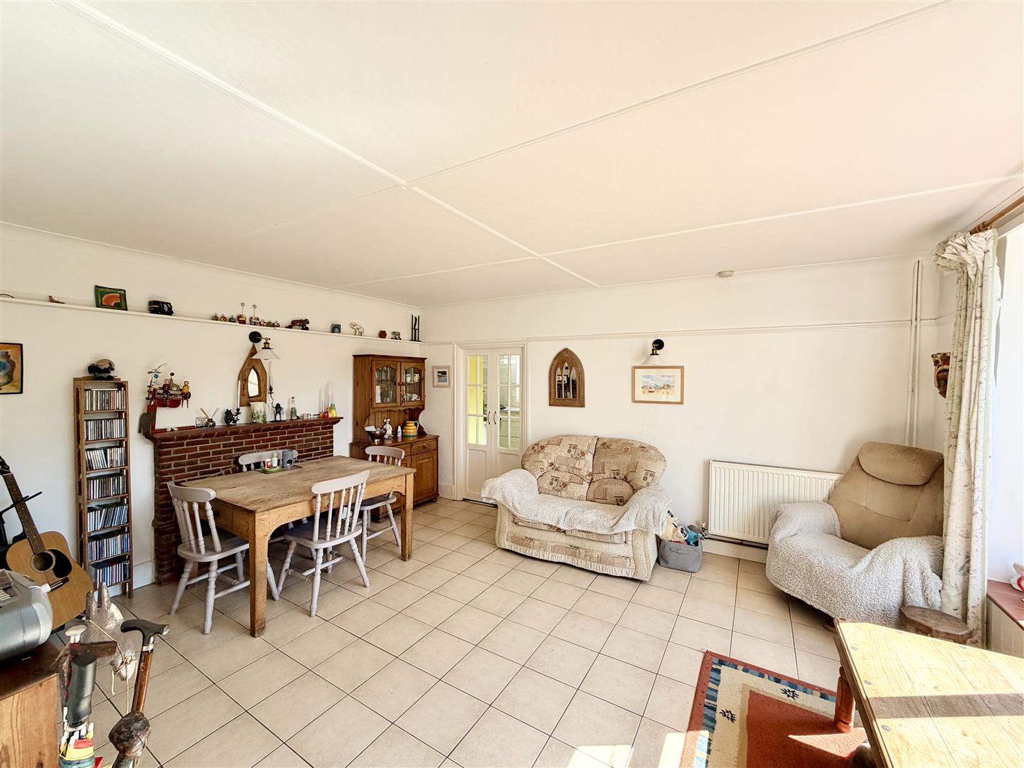 Tiled floor. Feature fireplace with a tiled hearth & brick surround with an open decorative grate. Ample space for a dining table. Picture rail. Large uPVC double-glazed south-facing window to the side. Twin wooden doors open into the kitchen.