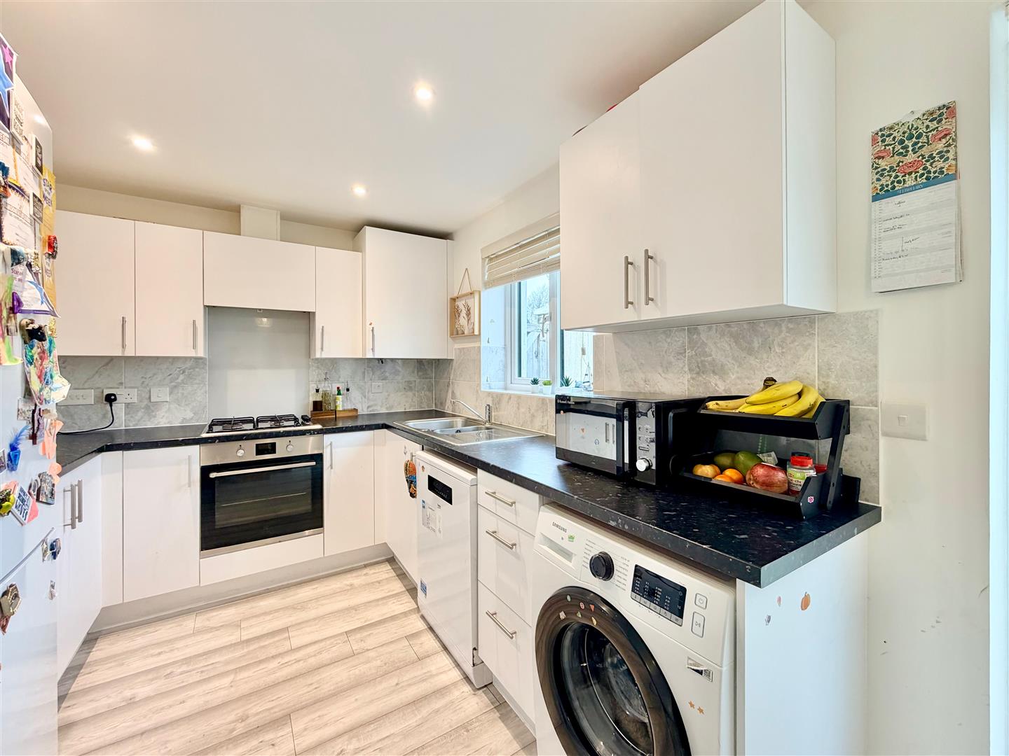 Ample space for dining table and chairs. Range of kitchen cabinets with matching fascias, work surfaces and tiles splash-backs. Stainless-steel one-&-a-half bowl single drainer sink unit. Built-in oven. 4-burner gas hob with a glass splash-back and a cooker hood above. Space and plumbing for a washing machine and dishwasher. Space for free-standing fridge-freezer. Under-stairs storage cupboard. Laminate flooring throughout. French doors with fitted blinds to the rear opening onto the garden. Additional window to the rear elevation.