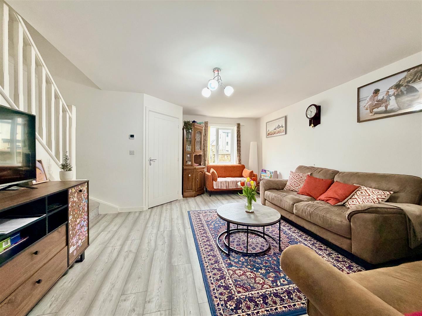 Staircase rising to the first floor. Laminate flooring. Window to the front elevation. Doorway opening into the kitchen/dining room.