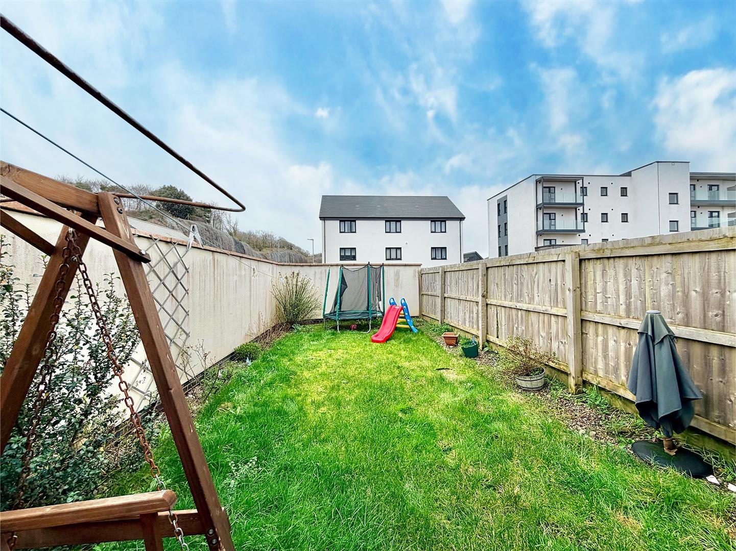 To the front there are 2 parking spaces, side by side. The rear garden is laid to lawn with bordering shrubs. There is also a paved patio area.