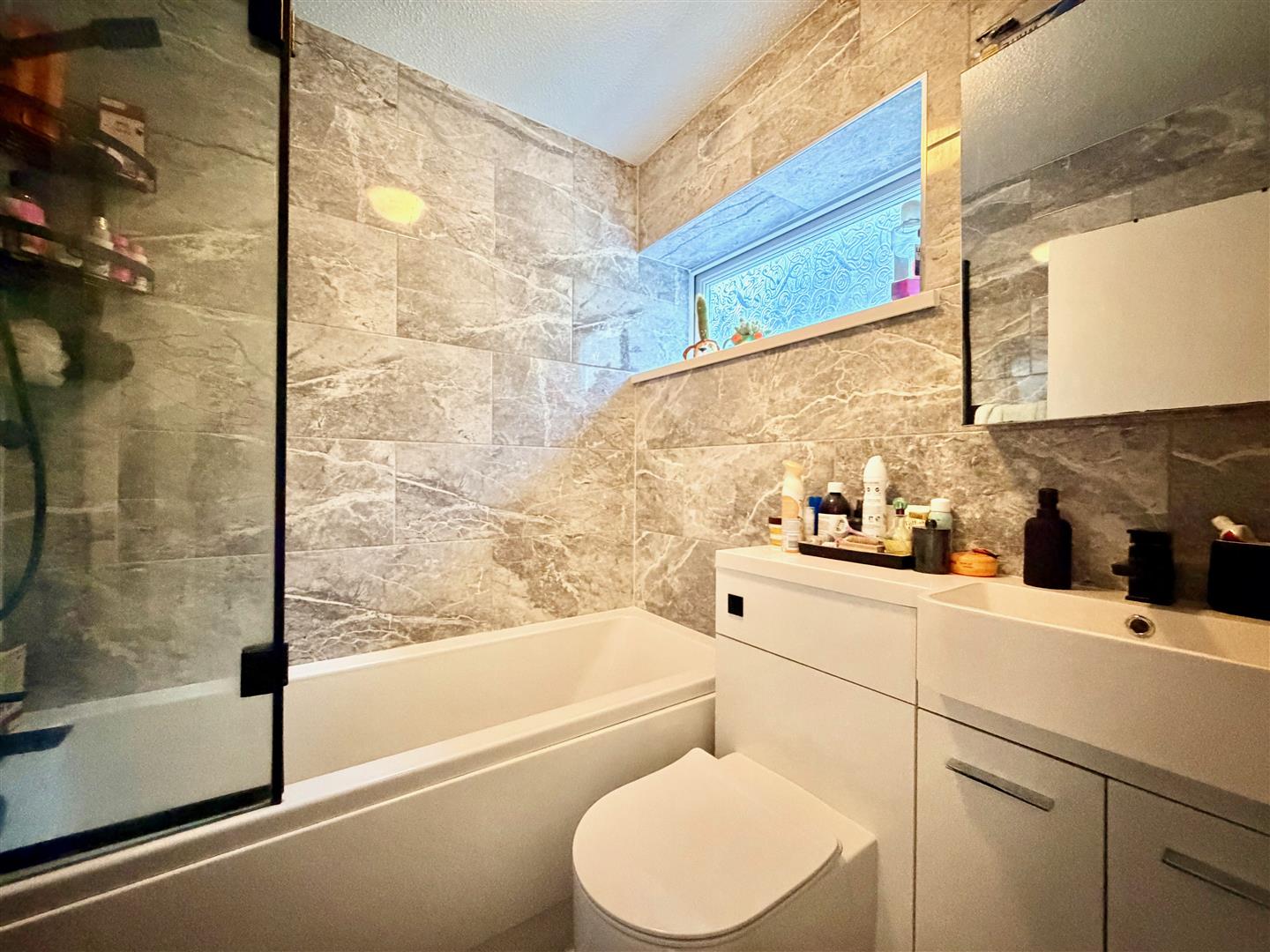 Comprising a bath with a shower system fitted over and a glass screen, basin and wc with a push-button flush, set into a cabinet providing storage and concealing the cistern. Towel rail/radiator. Fully-tiled walls. Obscured window.