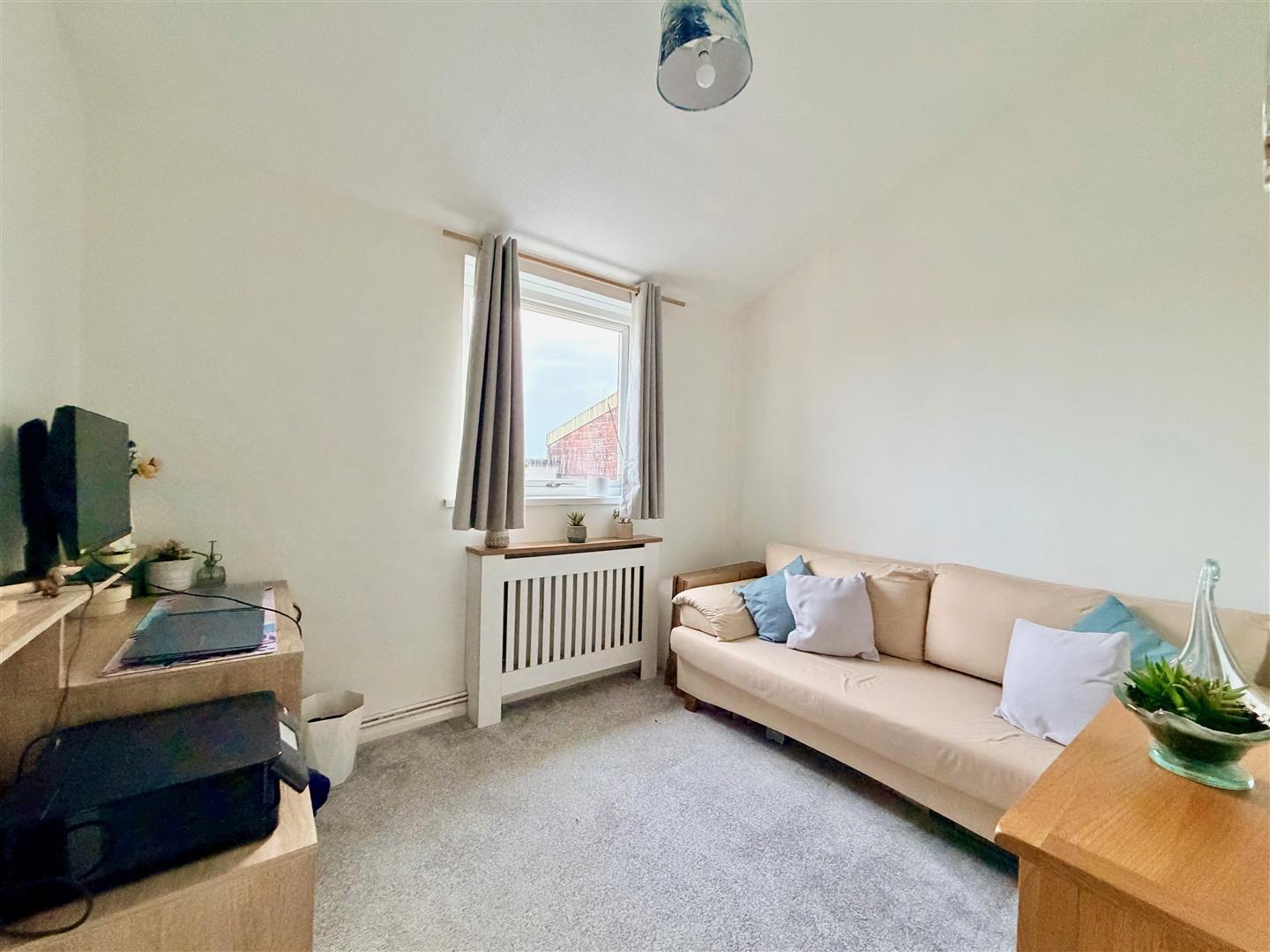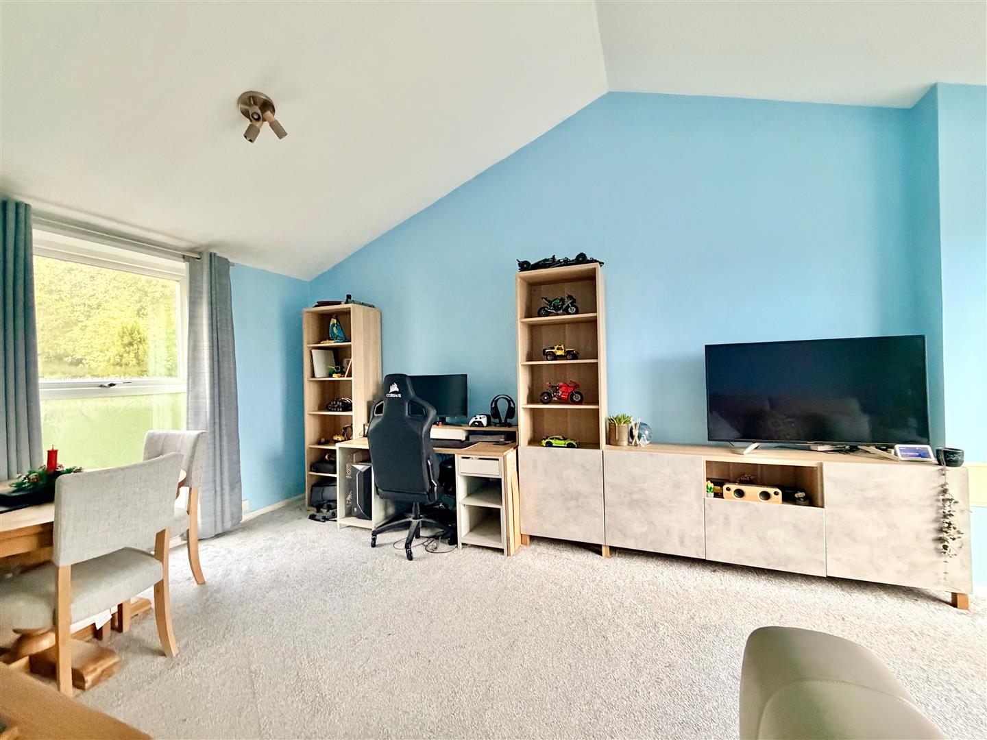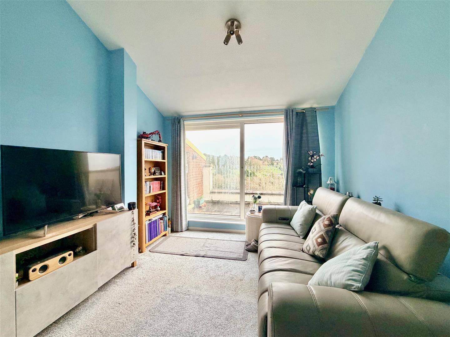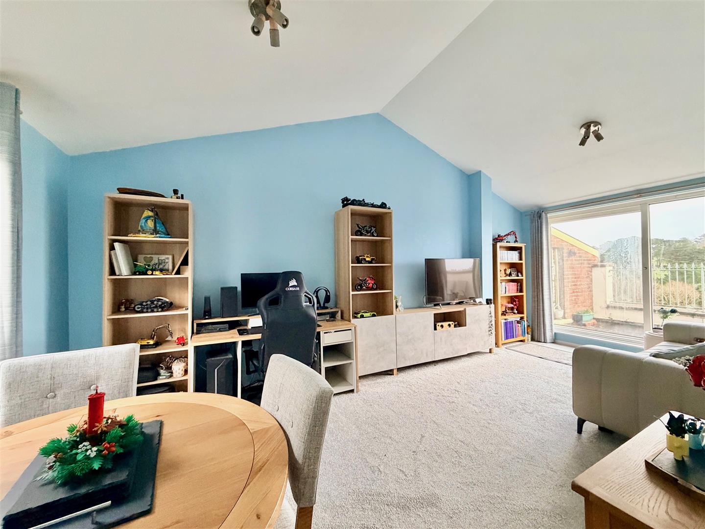An open-plan dual aspect room with a feature vaulted ceiling. Window to the front elevation and sliding double-glazed doors to the rear opening onto the balcony.