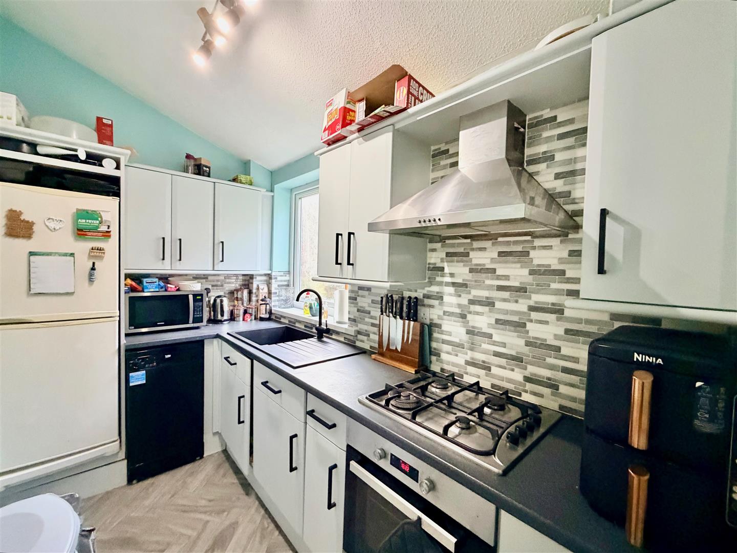 Providing access to the first floor accommodation. Storage cupboard fitted with shelving and also housing the gas boiler. Overhead skylight.