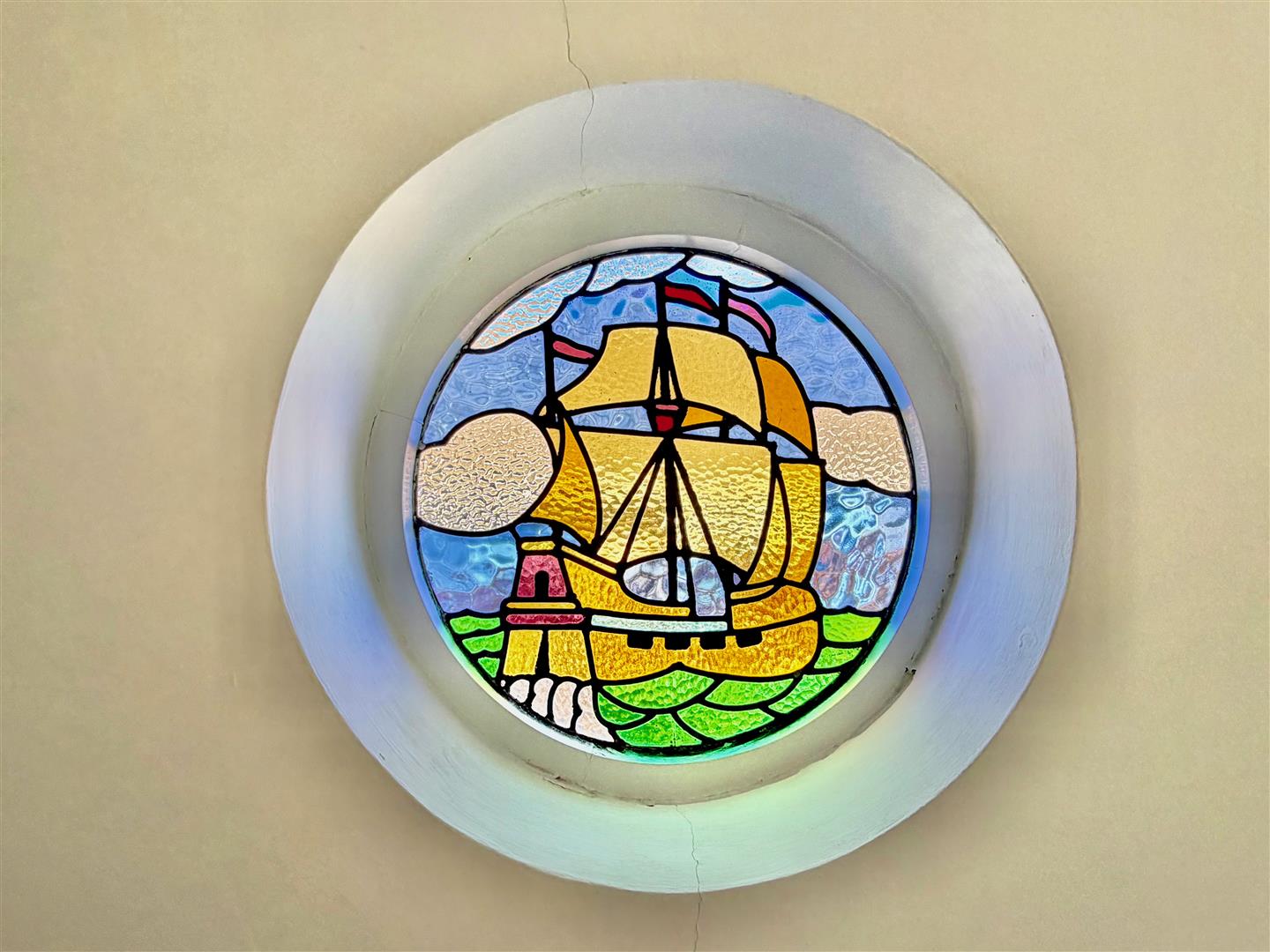 A generous reception room with windows overlooking the garden and French doors leading to outside. 2 feature circular stained glass windows to the side elevation. Wall-mounted electric fireplace.