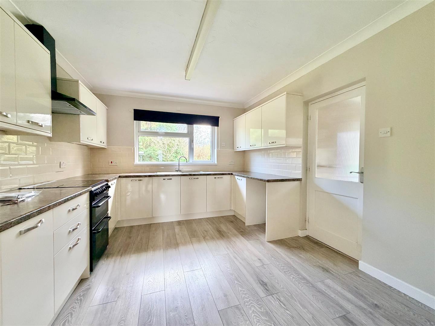 Range of matching base and wall-mounted cabinets with work surfaces and tiled splash-backs. Stainless-steel single drainer sink unit. Free-standing cooker with a cooker hood above. Space for dishwasher. Space for dining table and chairs. Laminate flooring. Window to the rear elevation overlooking the garden. Doorway to the side elevation opening into the utility room.