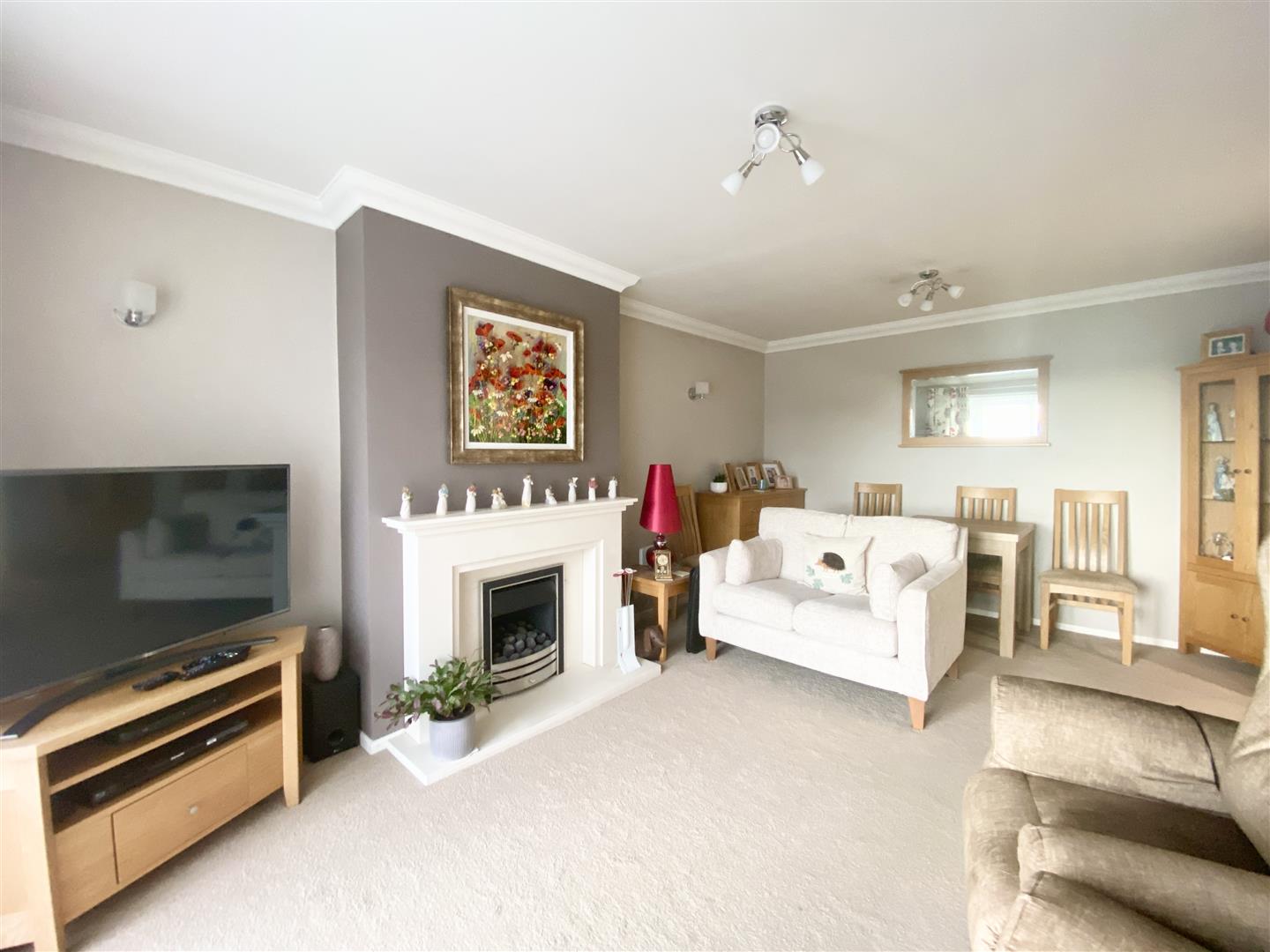 Feature gas fire set onto a polished stone hearth with surround and mantel. uPVC double-glazed patio doors to the front opening to the veranda.