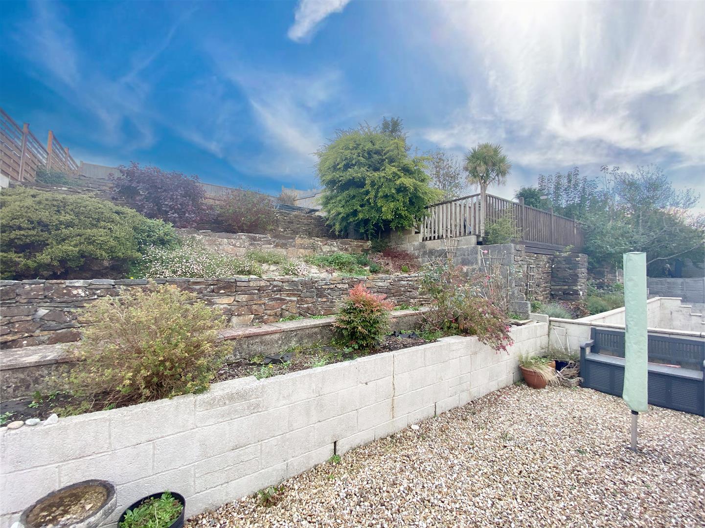 The property is approached via a brick-paved driveway leading to the garage, with areas laid to stone chippings and steps ascending to the front door. A walkway to the side leads through to the rear garden which is fully-enclosed and tiered, laid for low maintenance, including areas of stone chippings and pebbles interspersed with shrubs. At the top level a gate provides access to the adjoining fields. There are views over the embankment, Hardwick woods, Plympton and beyond.