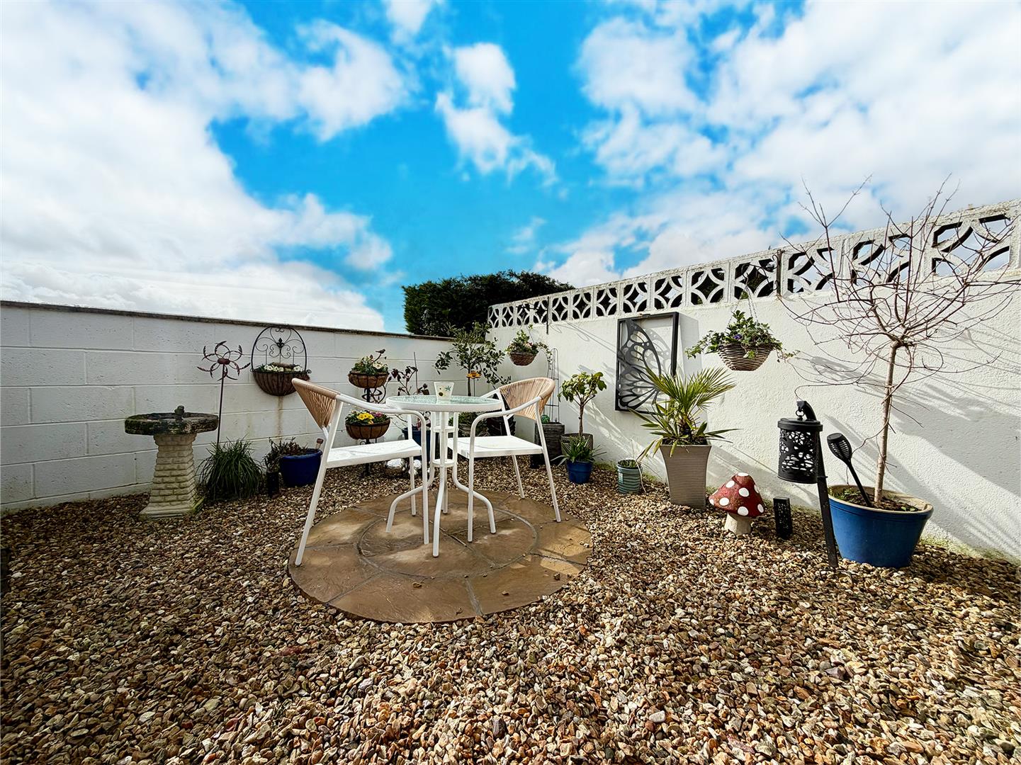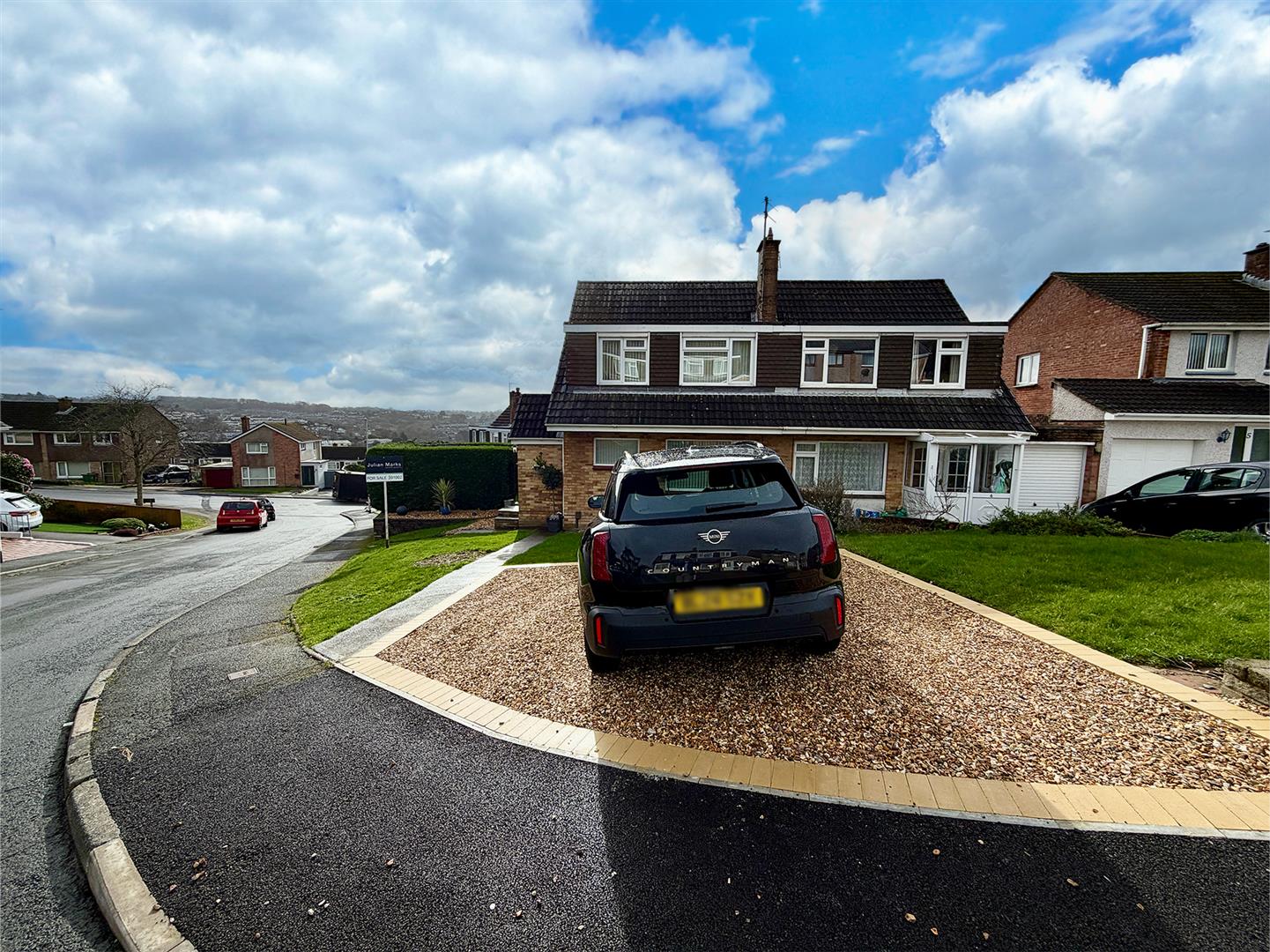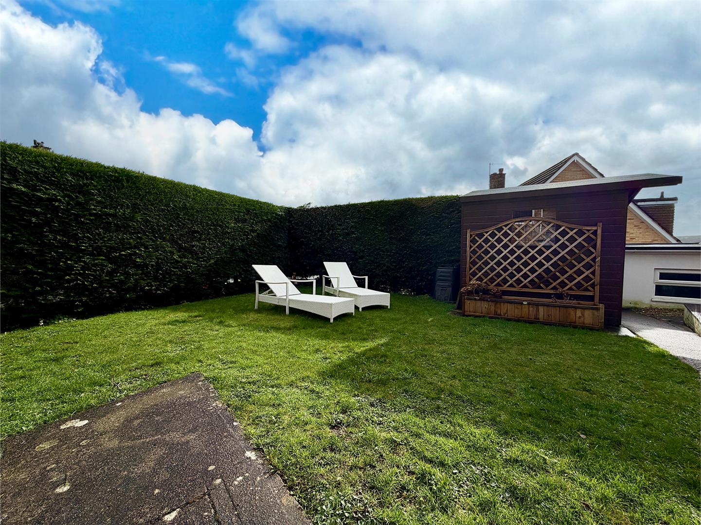 The property is approached via a concrete path bordered by an area of freshly-laid lawn. There is additional off-street parking and a metal gate provides access to the side and rear gardens. To the side there is an area laid to lawn and a shed, enclosed by hedge. This leads to a south-facing stone-chipped area enclosed by a painted brick wall and housing a greenhouse. Adjacent to the rear of the property is a raised decked seating area with lovely views over Plympton and beyond. A further gate provides access to the driveway and garage.