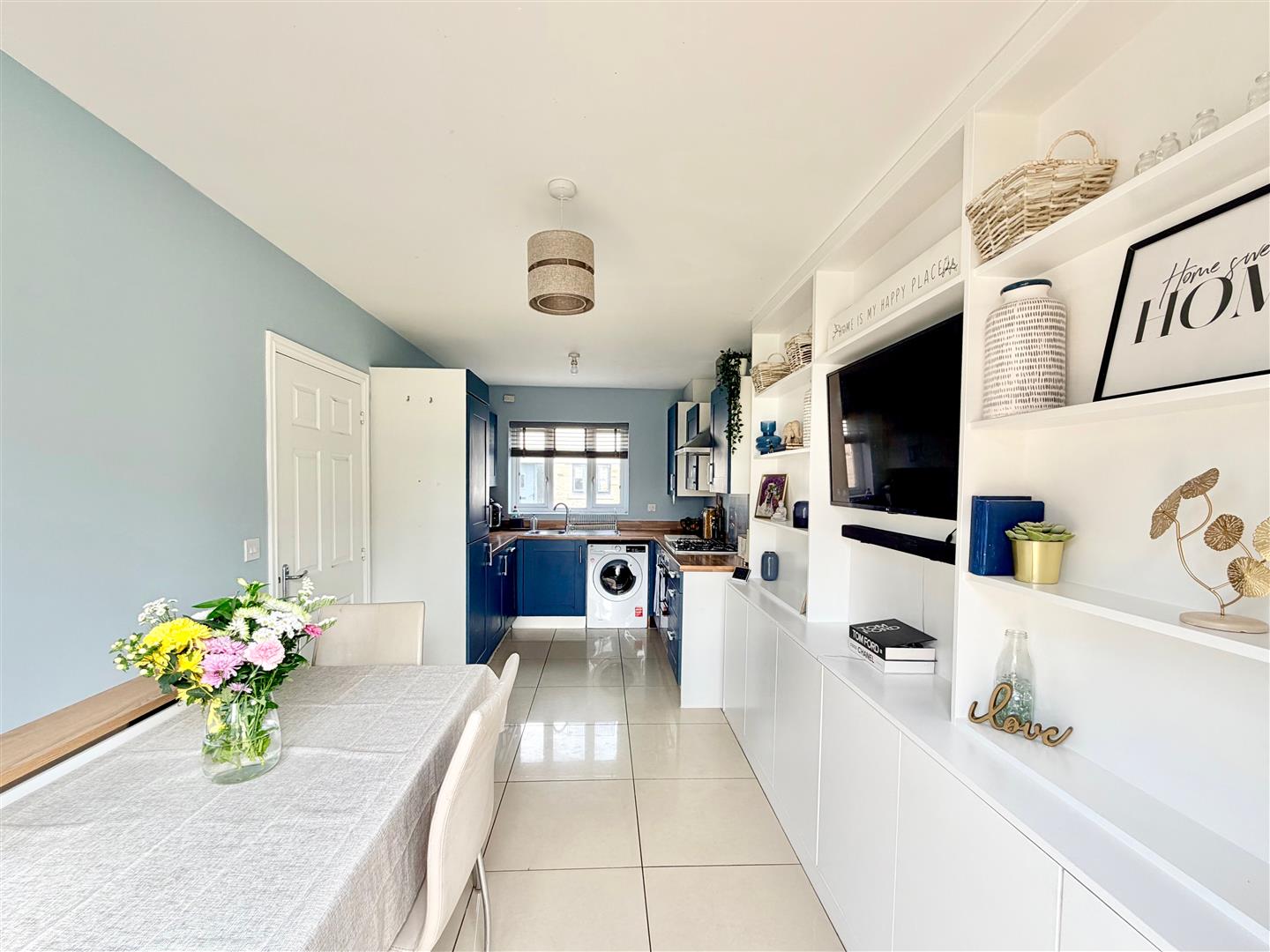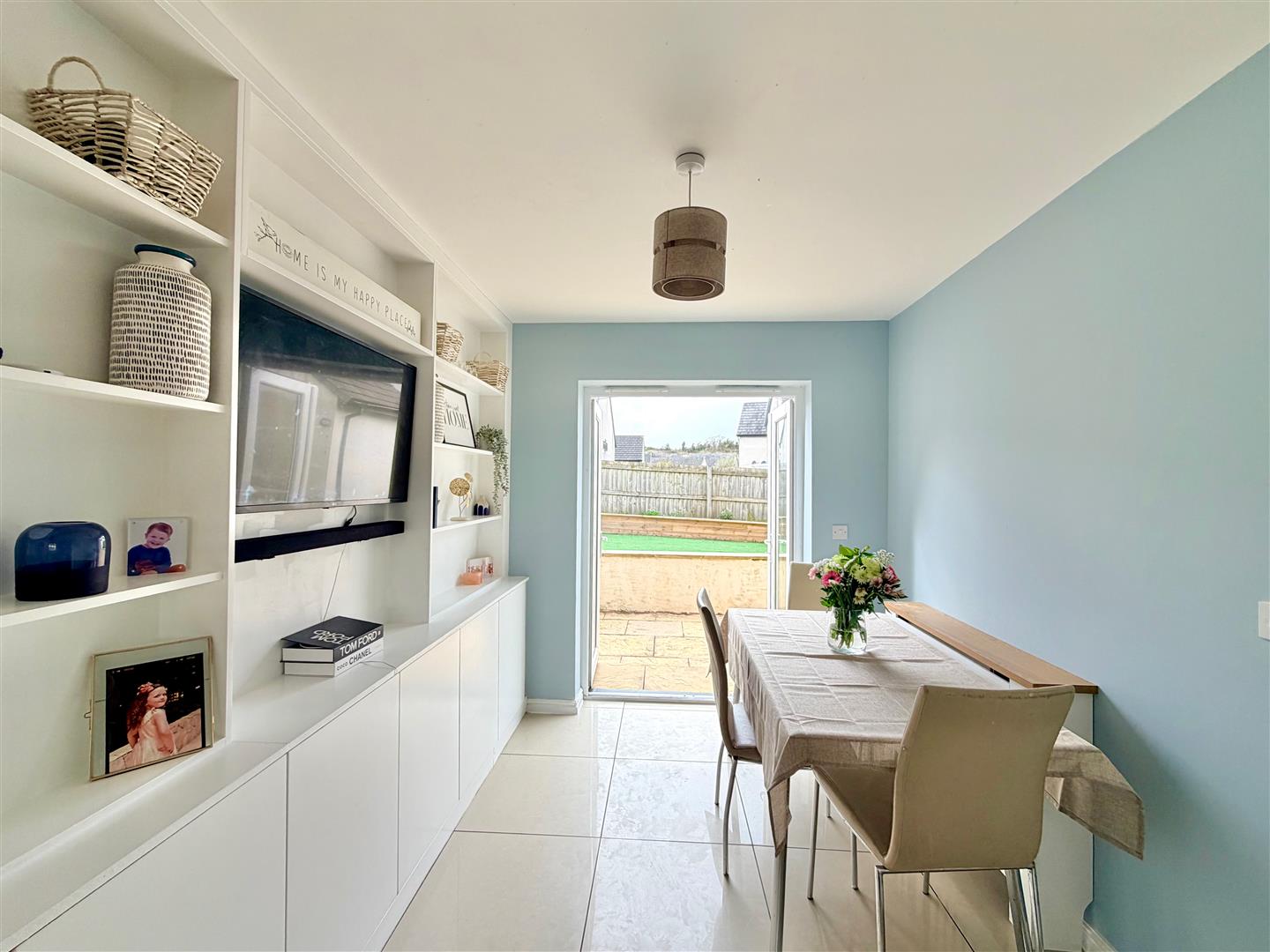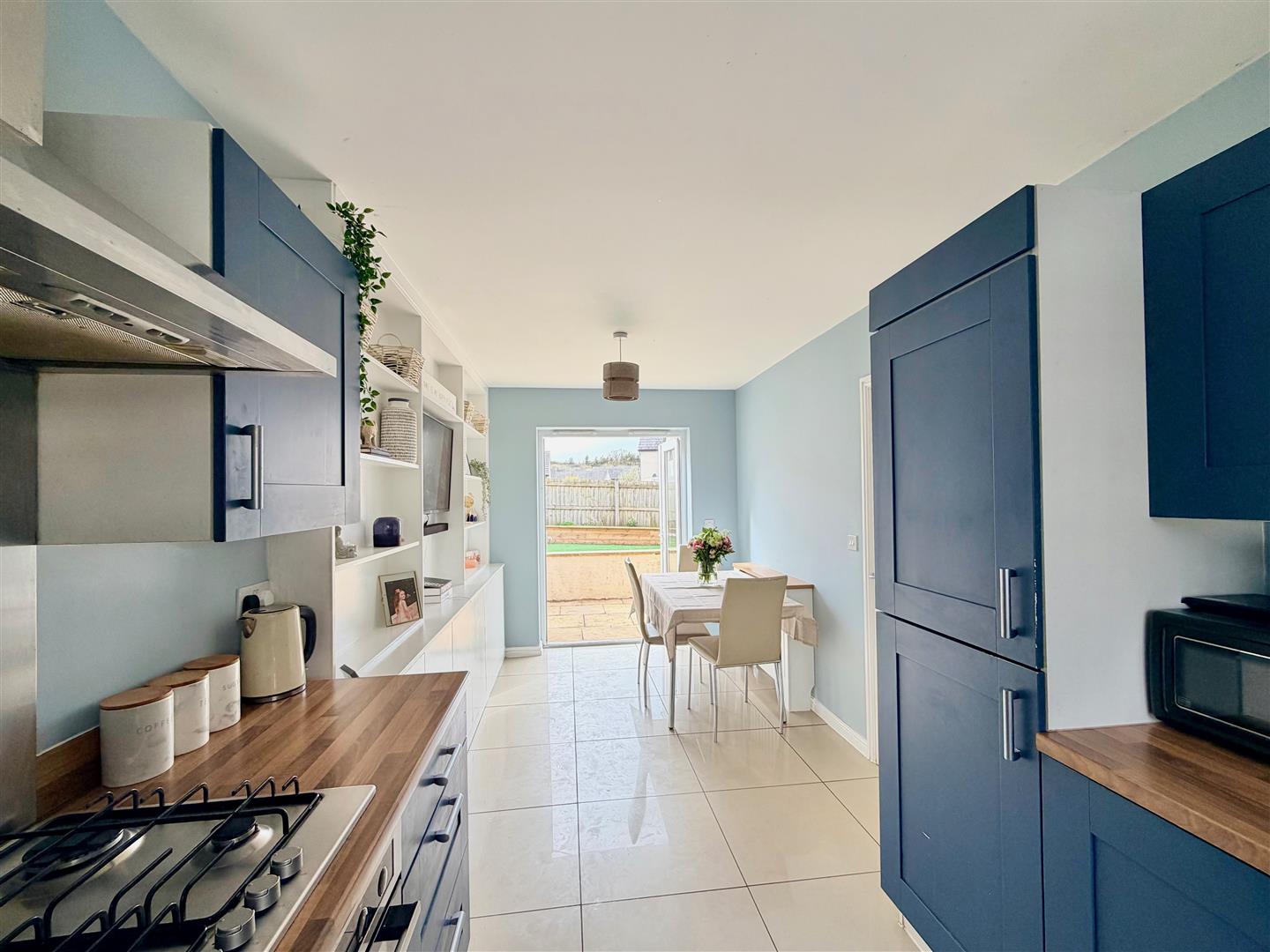A dual aspect room with a window to the front elevation and French doors to the rear opening onto the garden. Ample space for dining table and chairs. Built-in cupboards and shelving. Kitchen cabinets with matching fascias, work surfaces and splash-backs. Stainless-steel single drainer sink unit. Built-in oven. 4-burner gas hob with a stainless-steel splash-back and a cooker hood above. Space and plumbing for washing machine, fridge-freezer and dishwasher. Tiled floor throughout.