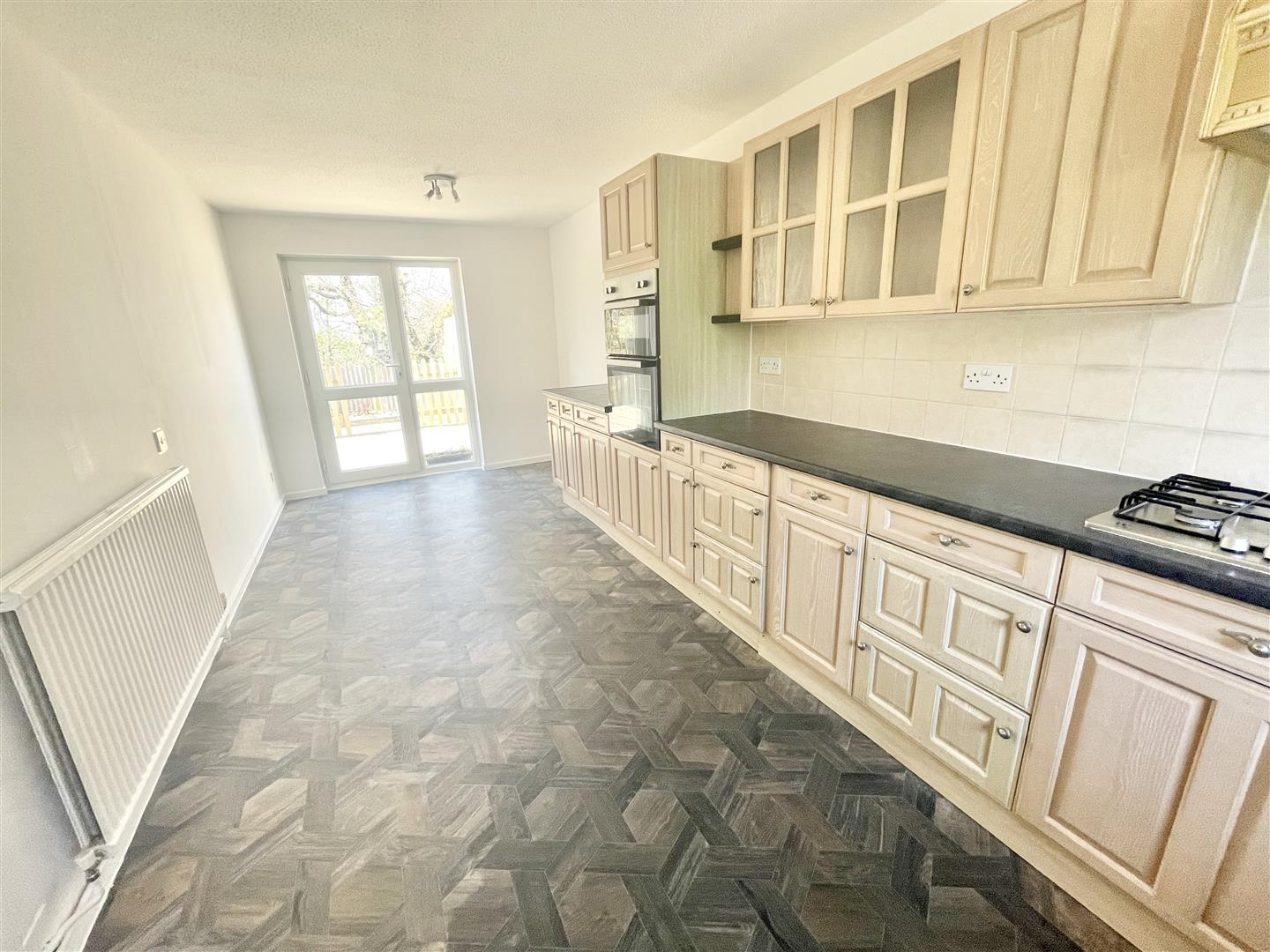 A dual aspect room with a double-glazed window to the front and a double-glazed window and door to the rear leading out onto the rear garden. Series of matching eye-level and base units with work surfaces. Inset single drainer, single bowl sink unit. Built-in 4-ring gas hob. Built-in electric oven. Built-in larder cupboard.