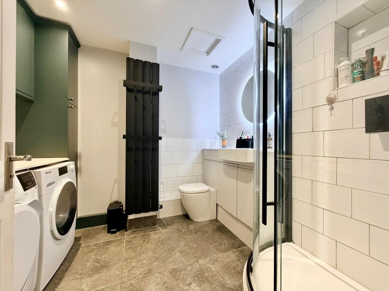 Comprising an enclosed tiled shower with a curved glass screen, basin and a wc with a push button flush set into a cabinet providing storage and concealing the cistern. Partly-tiled walls. The utility space has a range of base and wall-mounted cabinets together with work surface with space beneath for washing machine and tumble dryer. Tiled floor. Feature wall-mounted radiator.