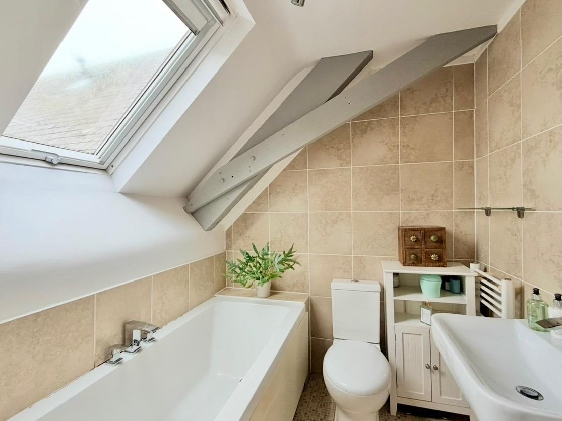 Comprising a double-ended bath with centrally-positioned taps plus additional rinsing attachment, wc and pedestal basin. Fully-tiled walls. Velux-style style skylight.