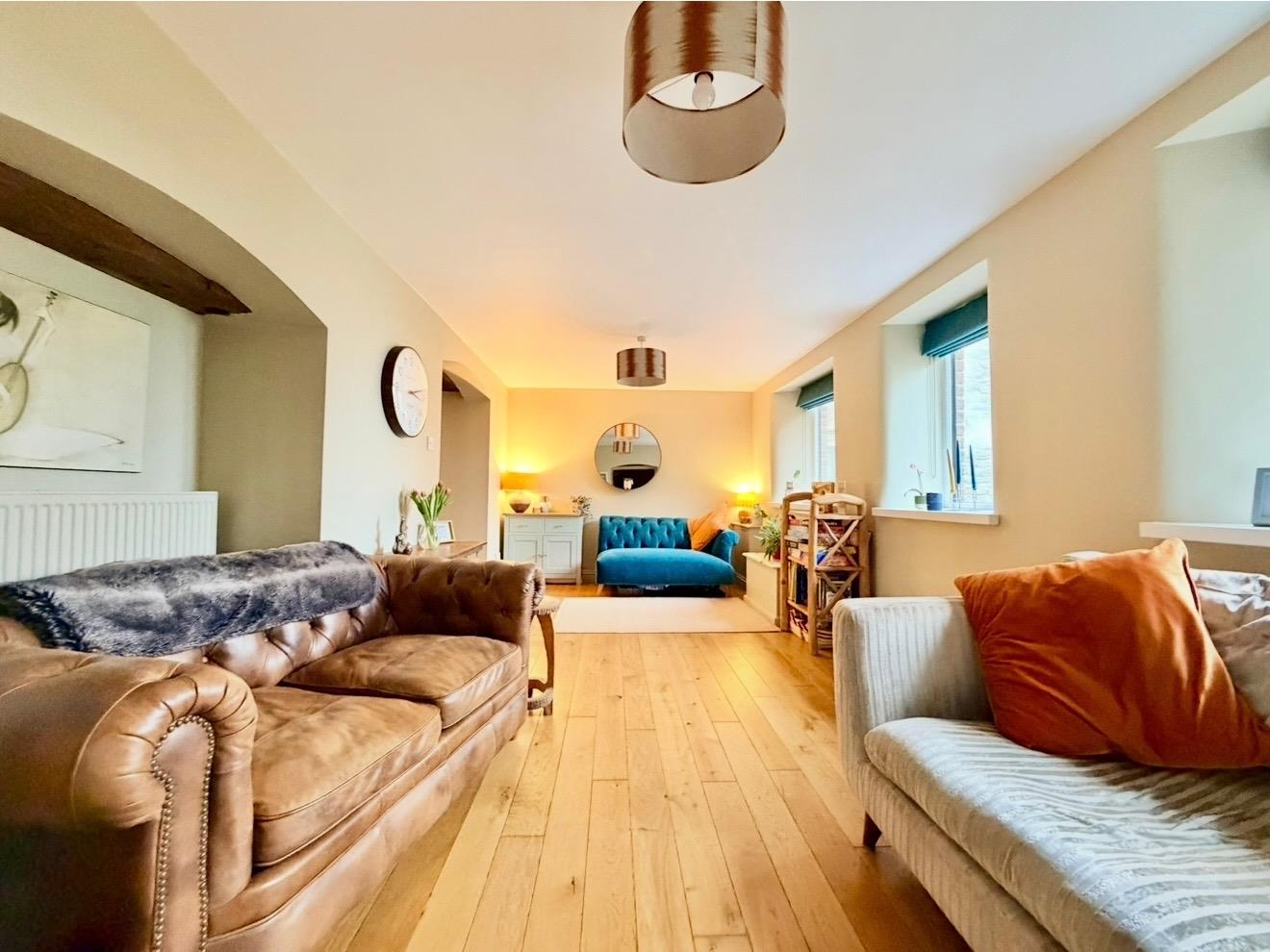 A superb living room with 3 windows providing countryside views. 2 feature alcoves with exposed timber. Cupboard housing the consumer unit. Hard wood flooring throughout.