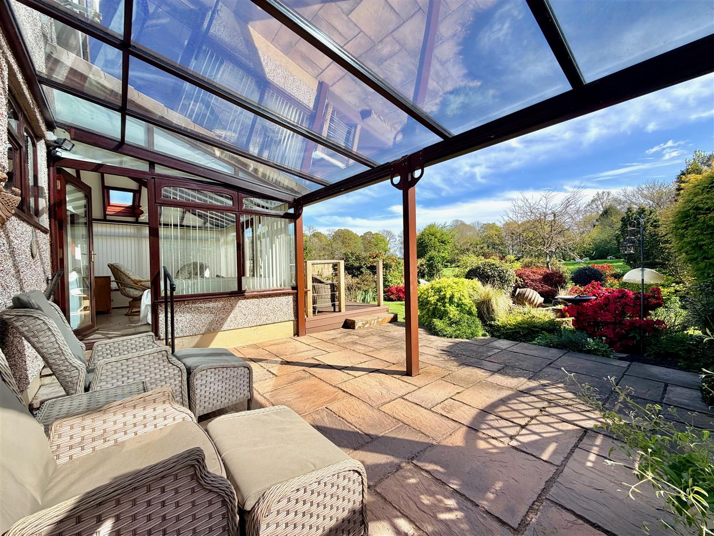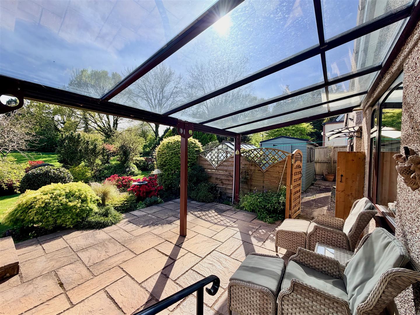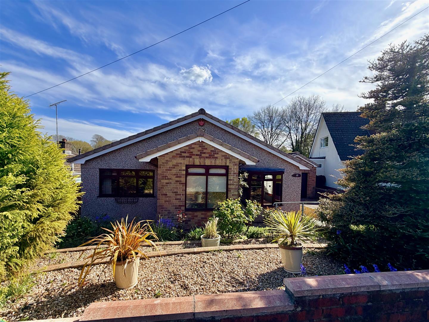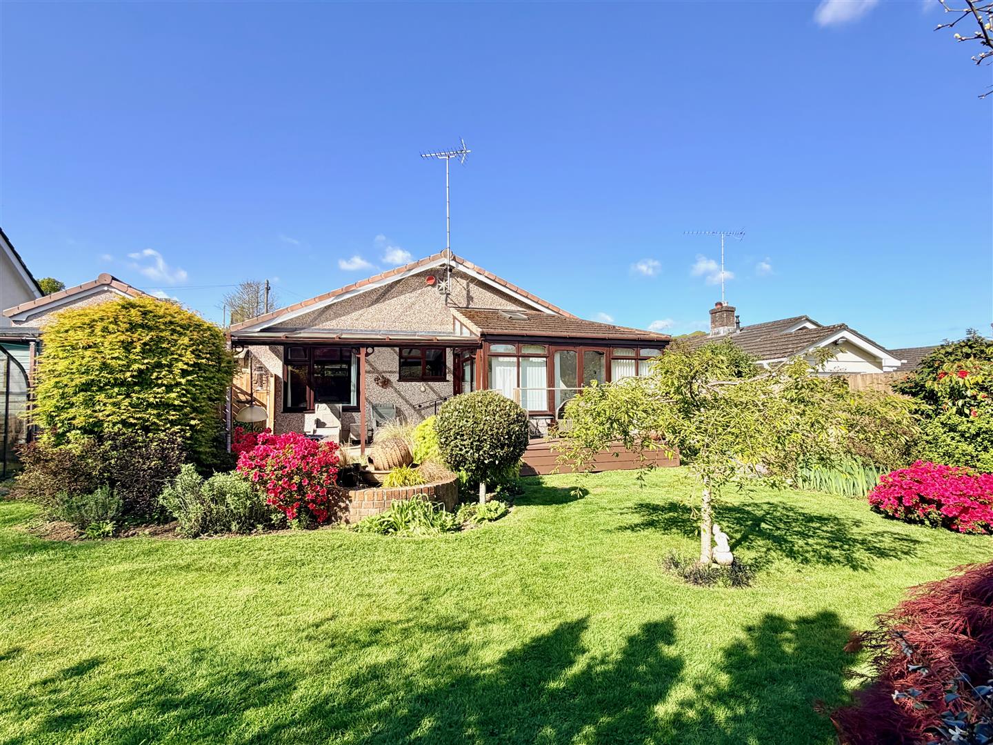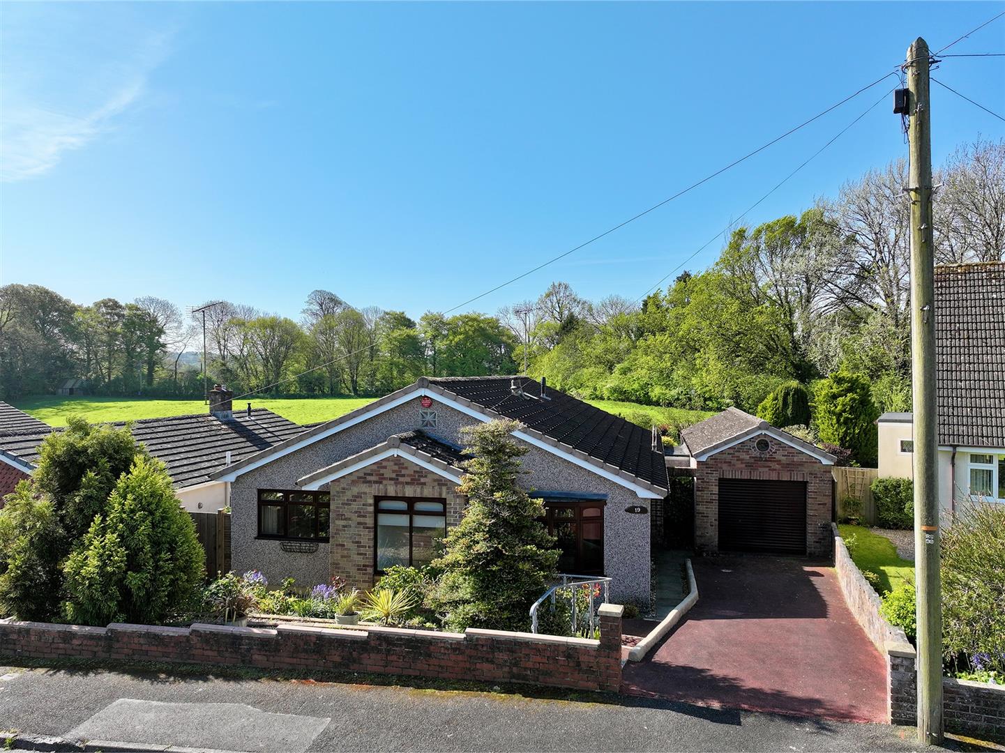 A tarmac driveway leading to the garage and providing off-road parking. The front garden has areas laid to chippings and shrubs. A pathway leading through a timber gate accesses the rear garden. The rear garden is a particular feature of this property and enjoys a southerly aspect, offers a high degree of privacy and backs onto open countryside. The garden is mainly laid to lawn with a variety of mature planting together with a patio area, composite decking area plus a covered outdoor seating area built adjacent to the rear of the bungalow. There is also a greenhouse.