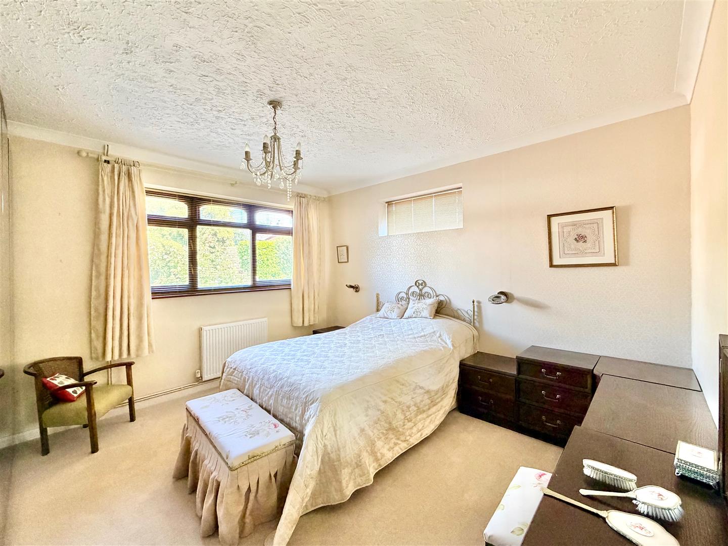 Dual aspect with windows with fitted blinds to the front and side elevations. Range of built-in wardrobes with mirrored doors, plus dressing table and drawer units.