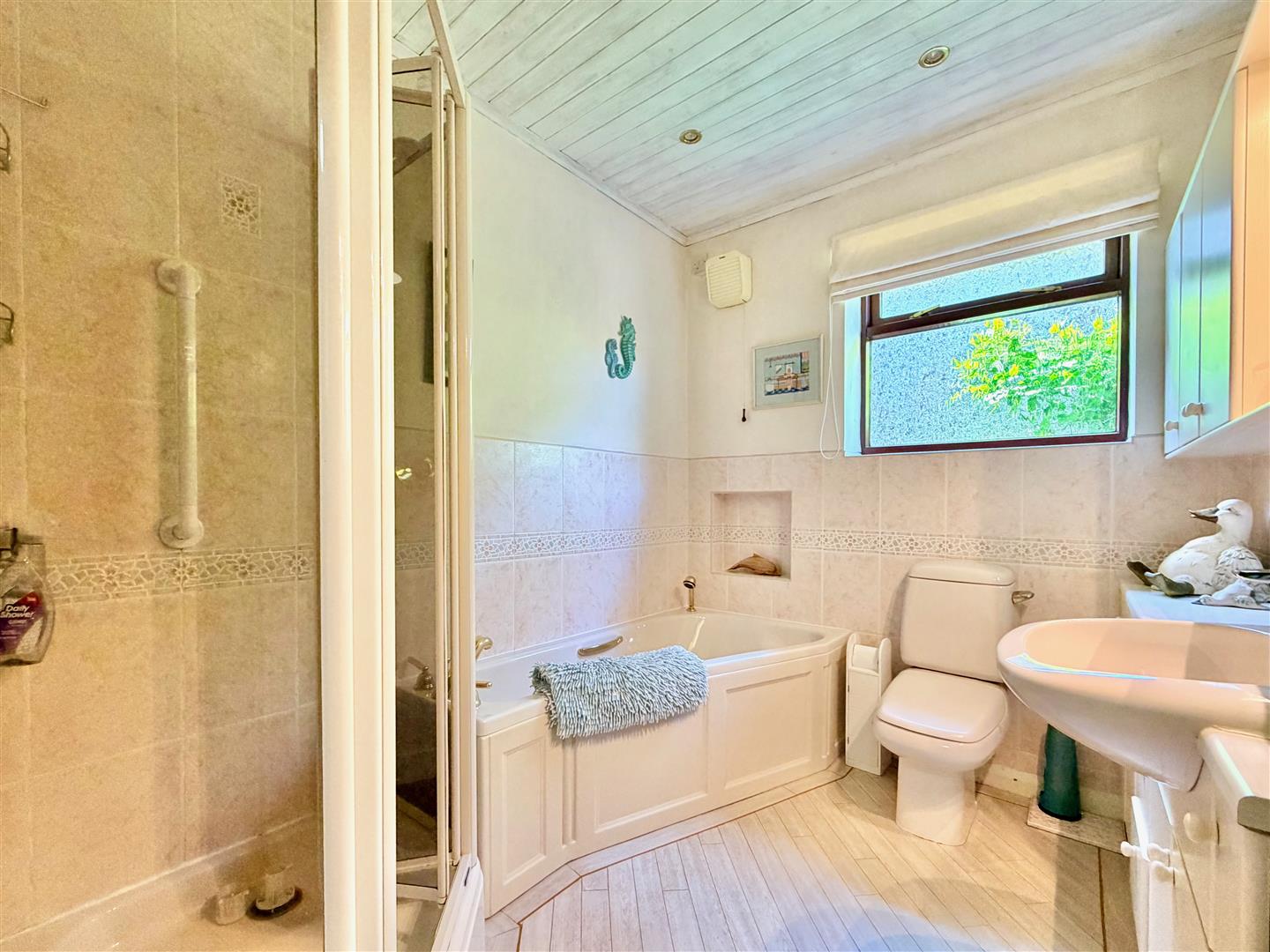 Fitted with a 4-piece suite comprising a bath, separate shower, wc and basin constructed within a cabinet providing storage. Additional matching wall-mounted cupboard with mirror and lighting. Towel rail/radiator. Fitted flooring. Obscured window to the side elevation,