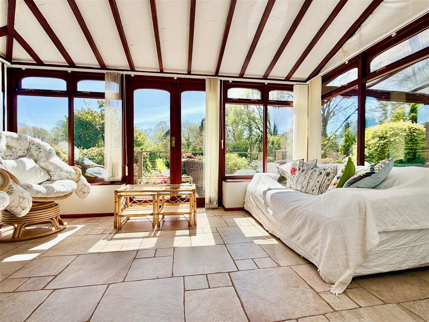 Windows with fitted blinds to 3 sides. Pitched roof with skylights. Tiled floor. Doorway leading to outside. Fabulous views over the garden towards the surrounding countryside.