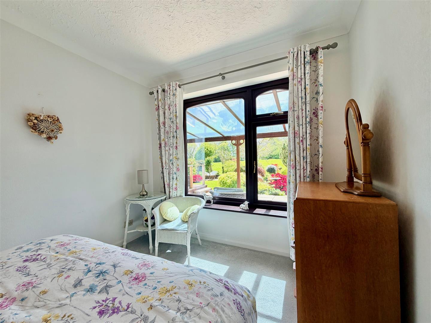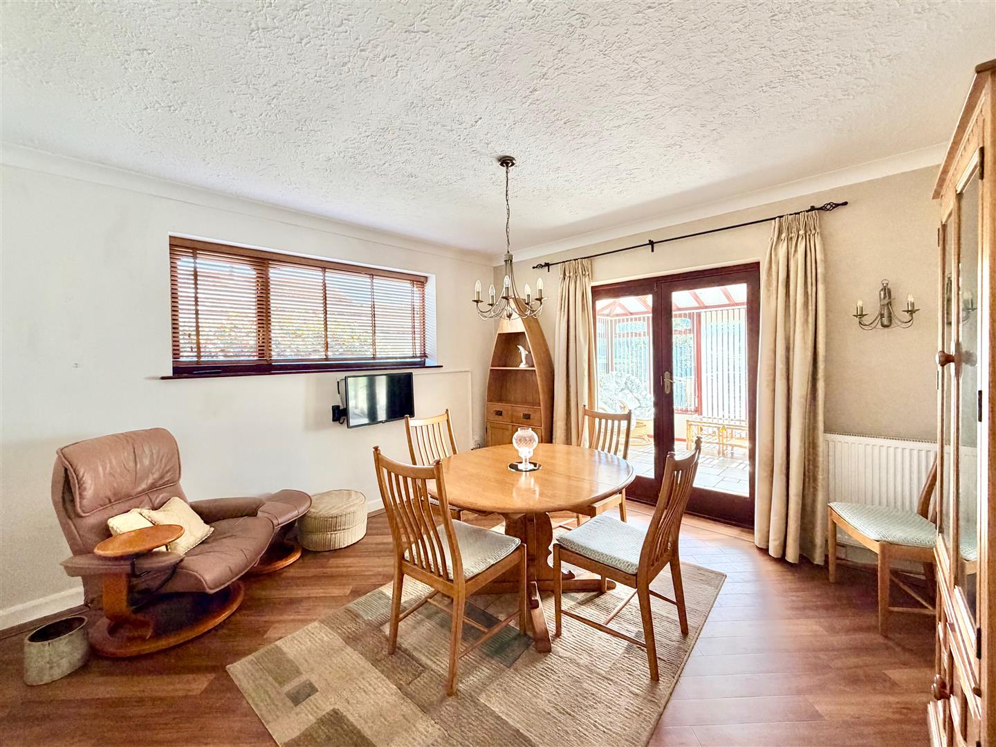 Dual aspect with a window with fitted blind to the side elevation and glazed doors opening into the conservatory. Fitted flooring.
