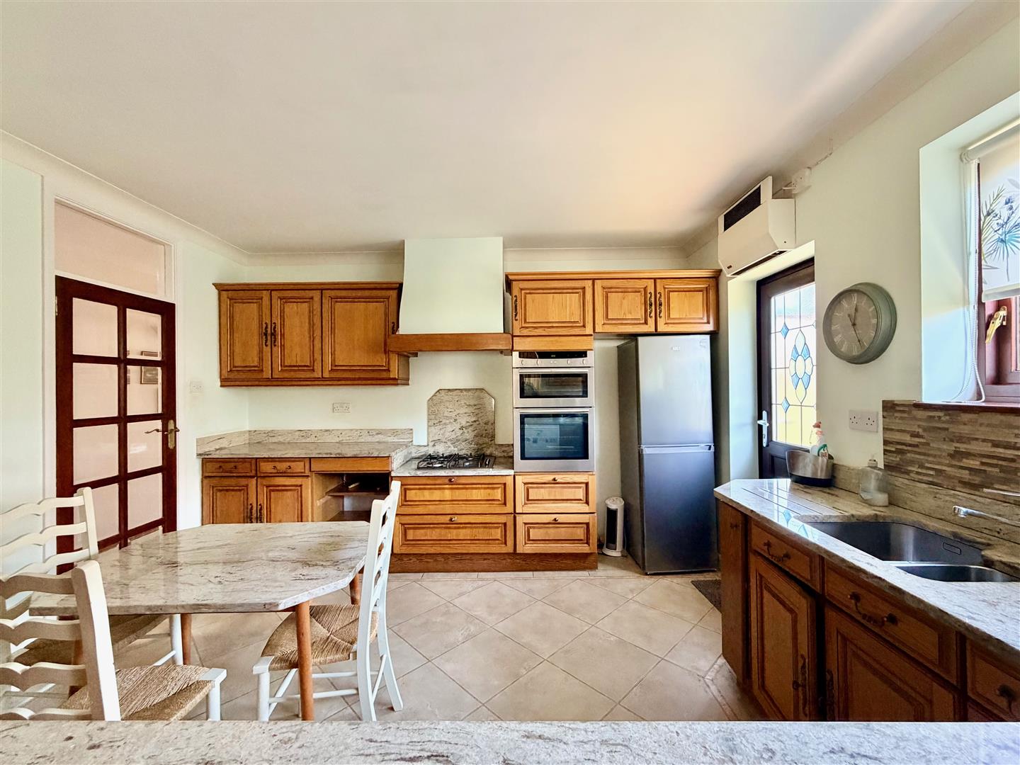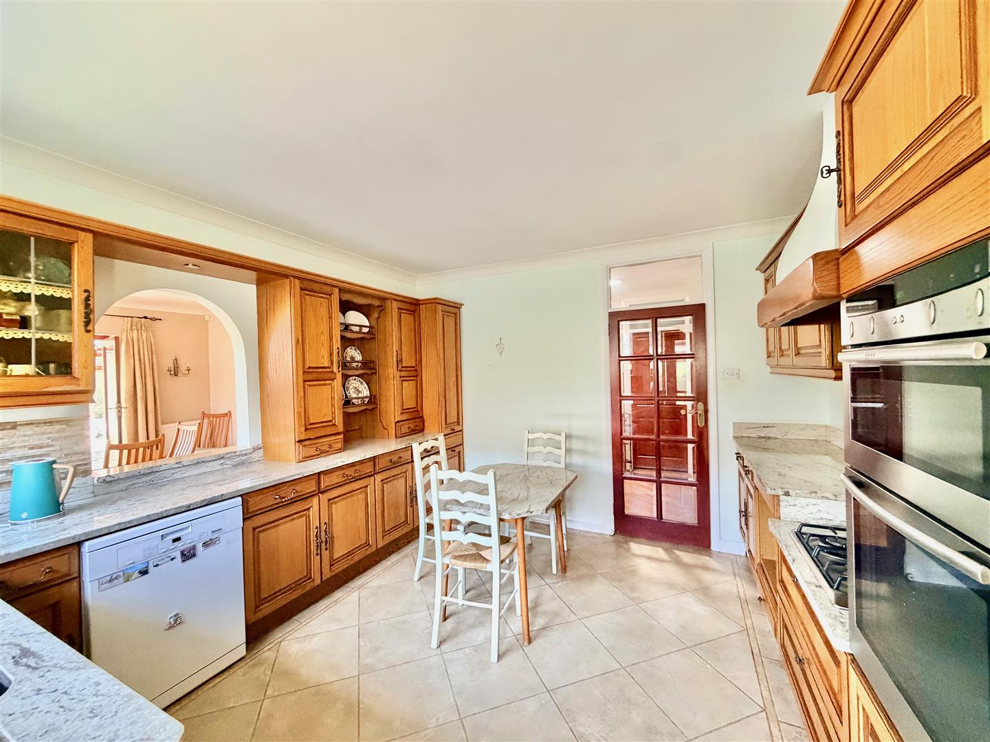 Range of fitted cabinets with matching fascias complemented by polished granite work surfaces and splash-backs. Breakfast table and chairs with matching granite table top. Inset stainless-steel one-&-a-half bowl sink unit with a work-top mounted mixer tap. Built-in NEFF double oven and grill. Separate stainless-steel 4-burner gas hob with a granite splash-back. Space for free-standing fridge-freezer. Free-standing Miele dishwasher. Window to the side elevation. Partly-glazed door leading to outside via the side elevation.