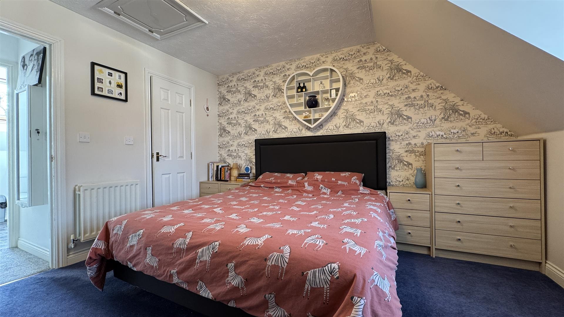 Access hatch to roof void. Double-glazed window to the front. Slightly restricted head height in one section of the room. Door to a walk-in wardrobe.