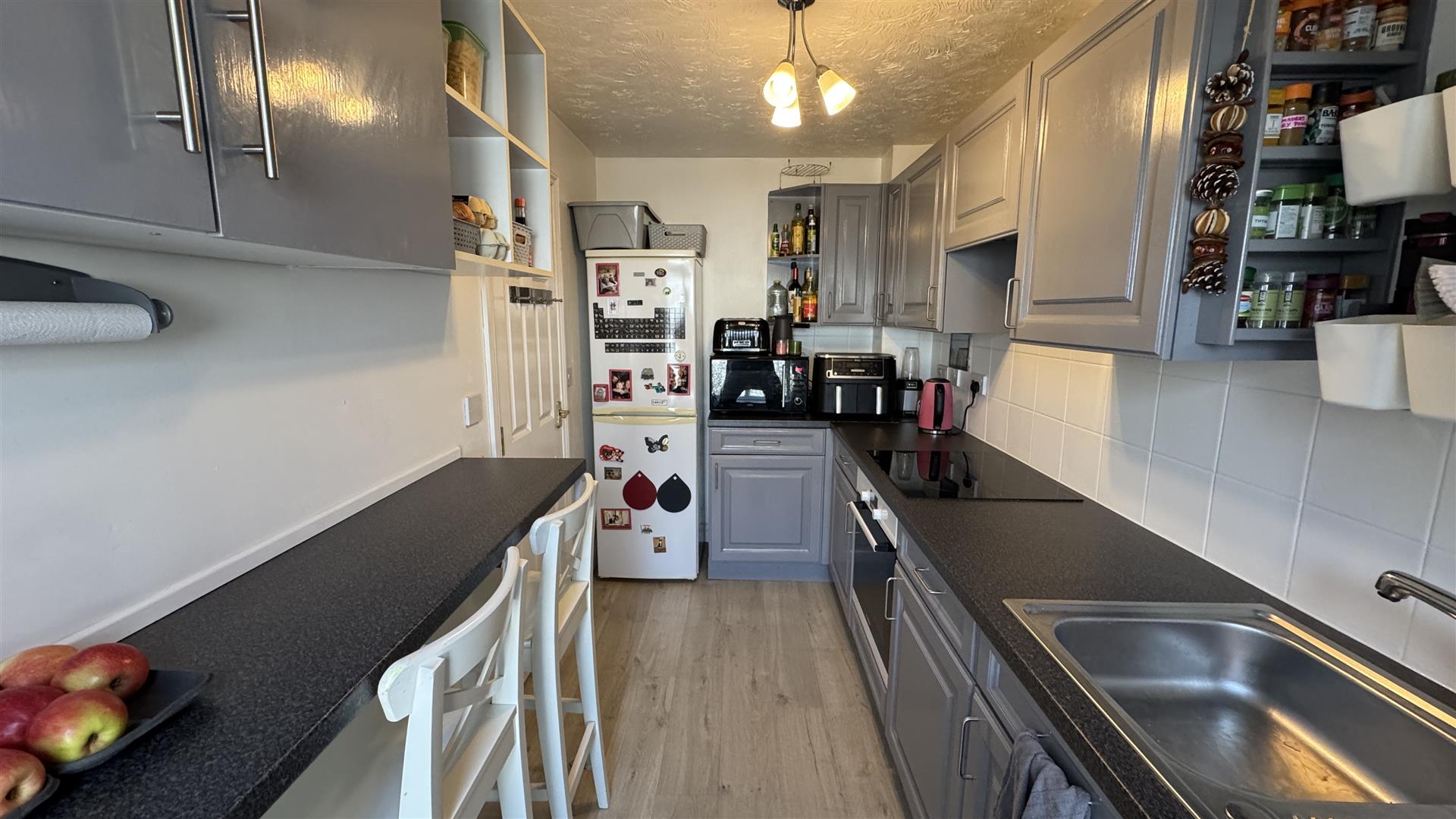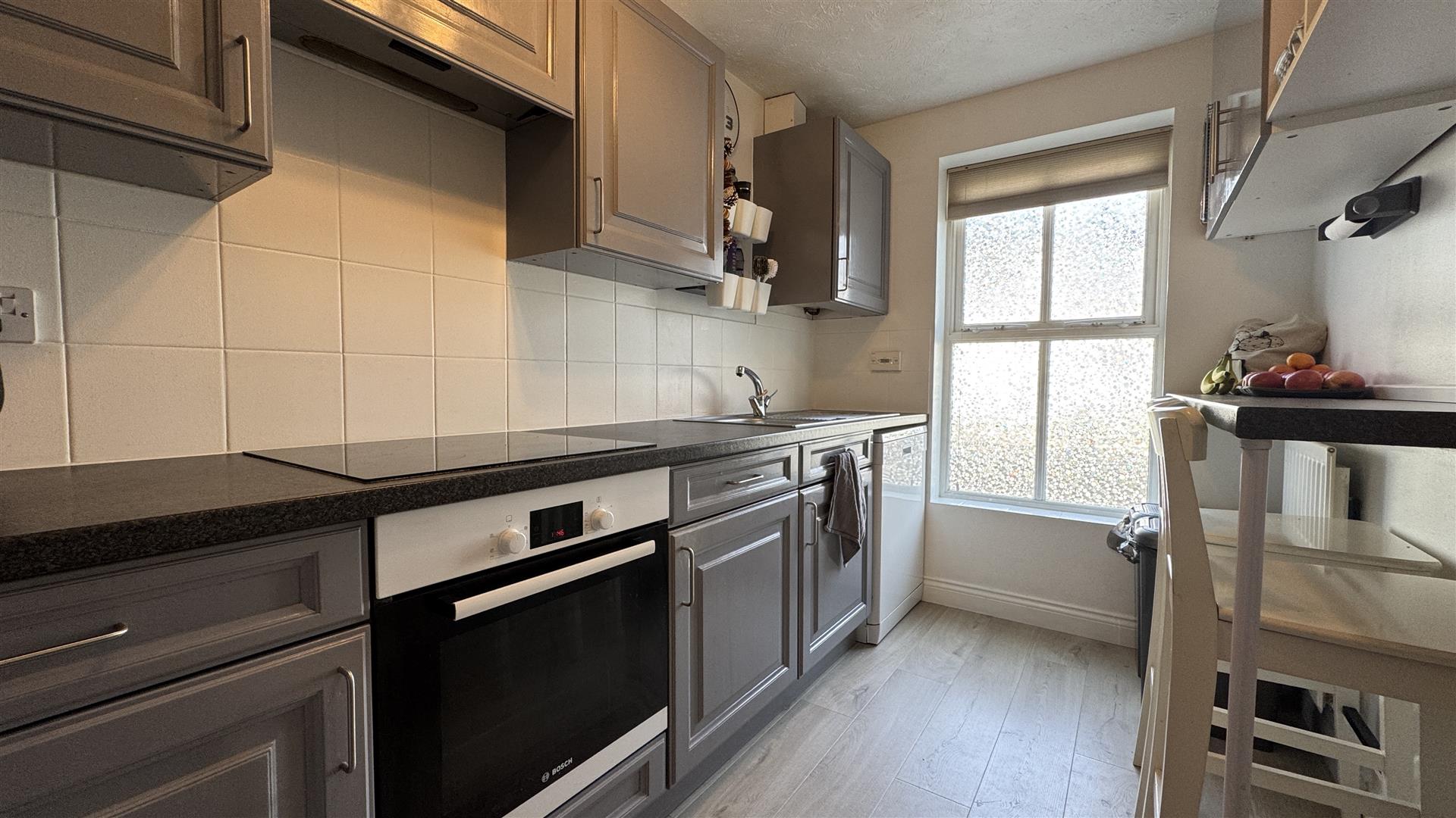 Matching base & wall mounted units to include fitted oven. Space for an upright fridge/freezer & dishwasher. Roll edge laminate work surface has inset 4 ring hob & stainless steel single drainer sink unit. Breakfast bar partly running along one wall. Double-glazed window to the front. Grey wood effect laminate flooring.