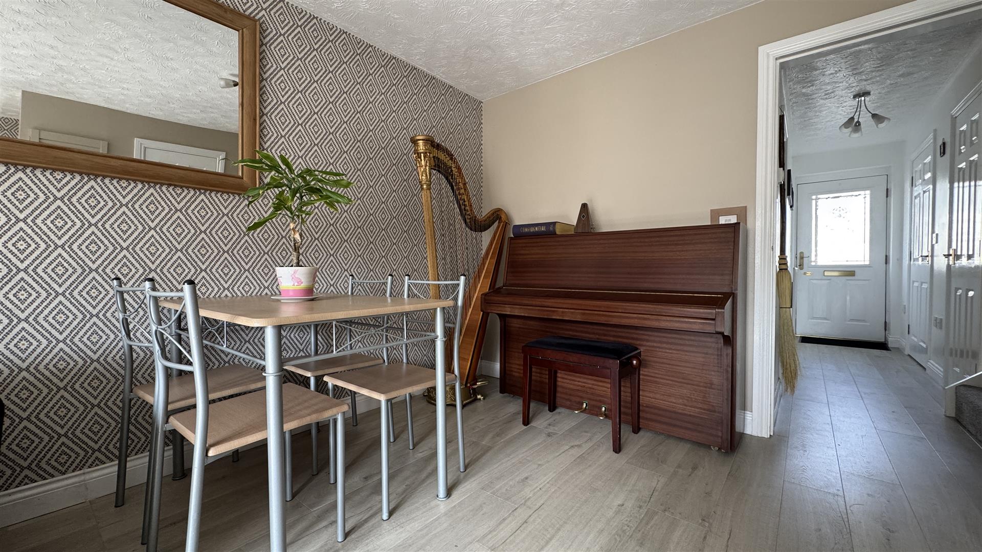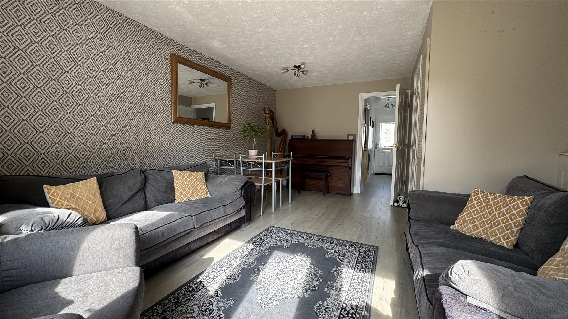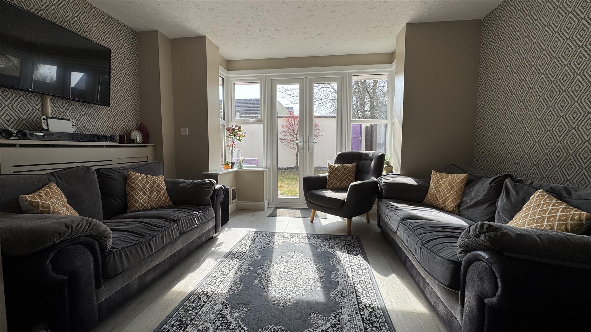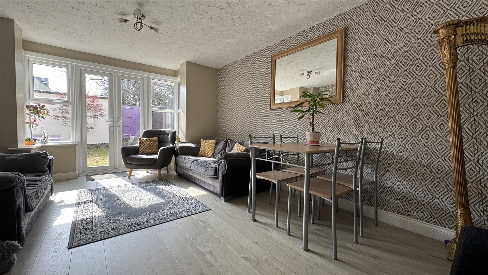Grey wood effect flooring. Ample space for dining table & sofas. uPVC double-glazed French doors open out to the rear garden in a box bay to the rear of the room. Further uPVC double-glazed windows to the rear & side. Position for a TV. Door to under-stairs storage cupboard. Further venetian style door opens to further storage.