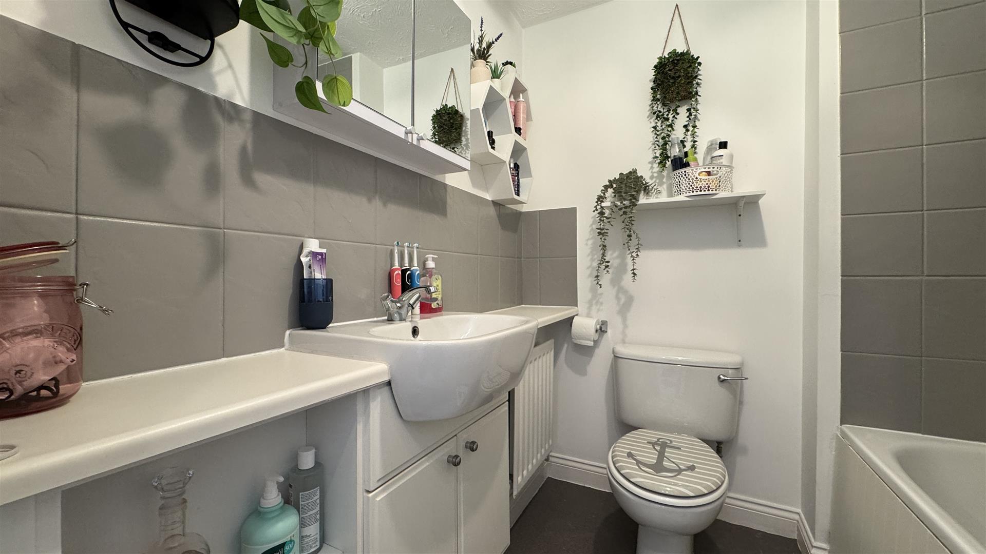Close coupled wc & wash hand basin inset into vanity storage cupboards below with tiled splash-back. Obscured double-glazed window to the front. Grey wood effect laminate flooring.