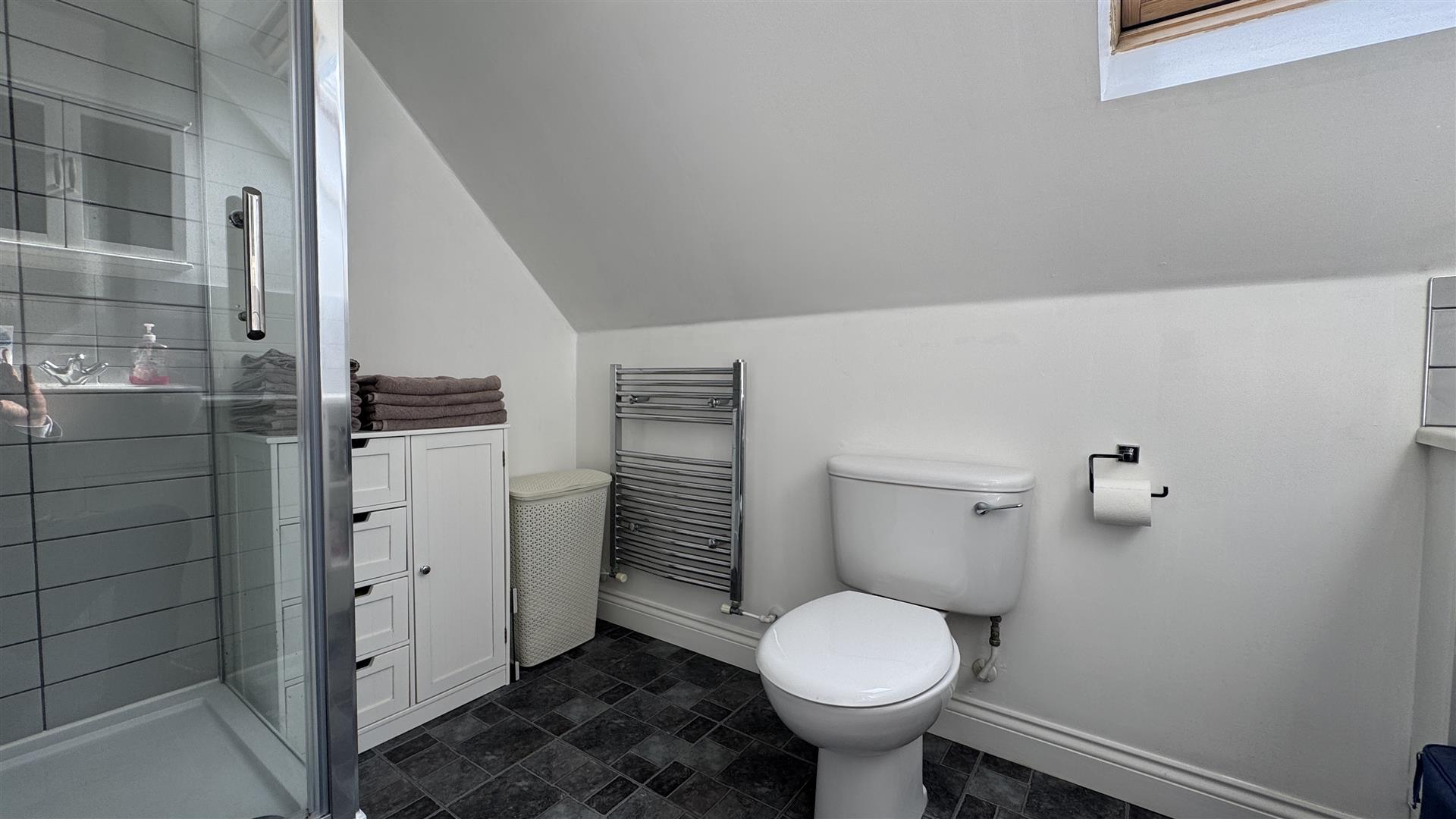 Matching suite of fitted shower cubical, close coupled wc & pedestal wash hand basin inset into vanity storage cupboards below. Chrome heated towel rail. Tiled effect vinyl flooring. Velux window to the rear.