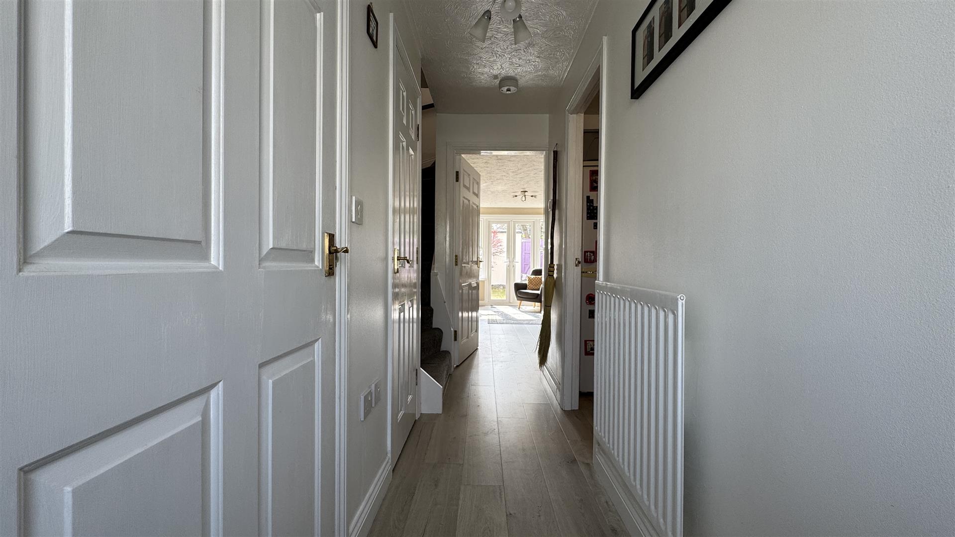 Grey wood effect laminate wood flooring. Staircase rising to the first & second floor landings. Doors leading to the cloakroom, storage cupboard has plumbing for washing machine & tumble-dryer on top with shelving above, kitchen & the lounge/diner.