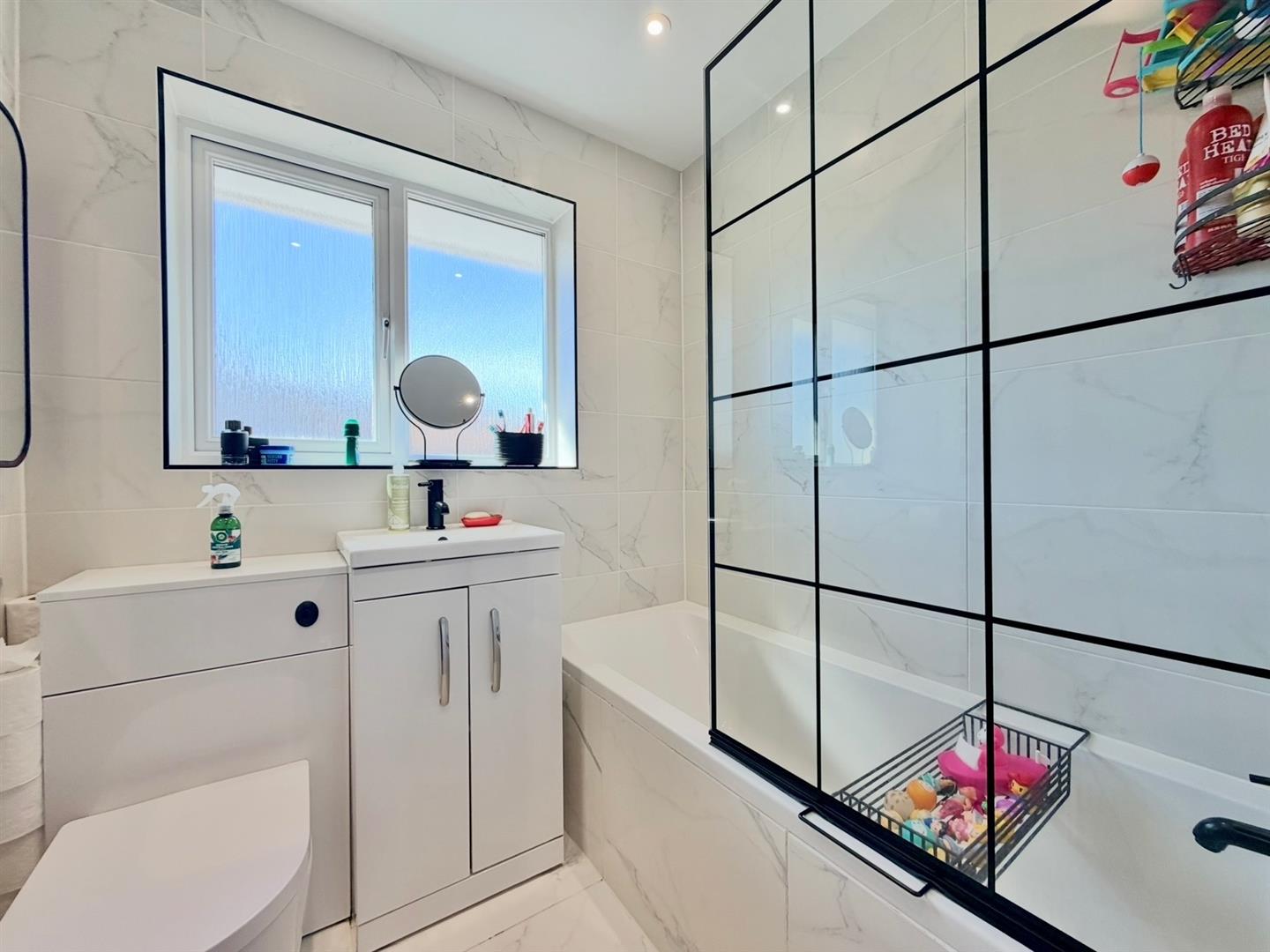 Comprising a bath with a shower system over and a glass shower screen, wc with a concealed cistern and a push button flush and a basin with a cupboard beneath. Towel rail/radiator. Tiled floor. Fully-tiled walls. Inset ceiling spotlights. Obscured window to the rear elevation.