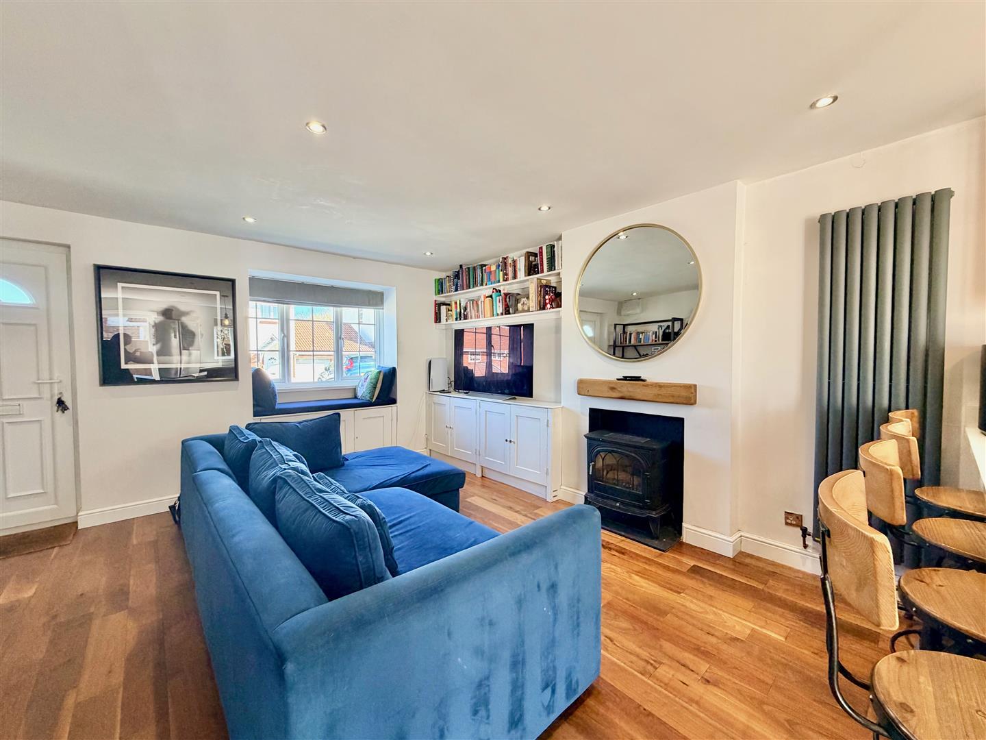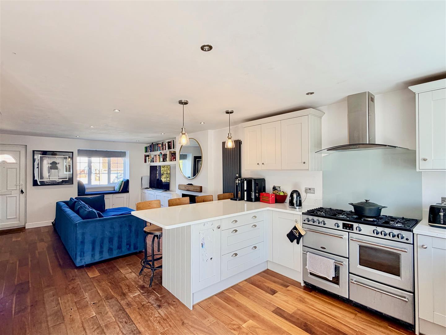 Chimney breast with storage cupboards and shelving to one side. Staircase with an oak balustrade, hand rail and newel post ascending to the first floor. Under-stairs storage cupboard. Ample space for seating and dining. Fitted kitchen with matching cabinets with quartz work-tops and splash-backs. Belfast-style sink with a work-top mounted mixer tap and a tap for filtered drinking water. Belling range-style cooker with a glass splash-back and a cooker hood above. Space for an American-style fridge-freezer. Built-in washing machine. Hard wood flooring throughout. Inset ceiling spotlights. Windows to the front and rear elevation. French doors to the rear opening onto the garden.