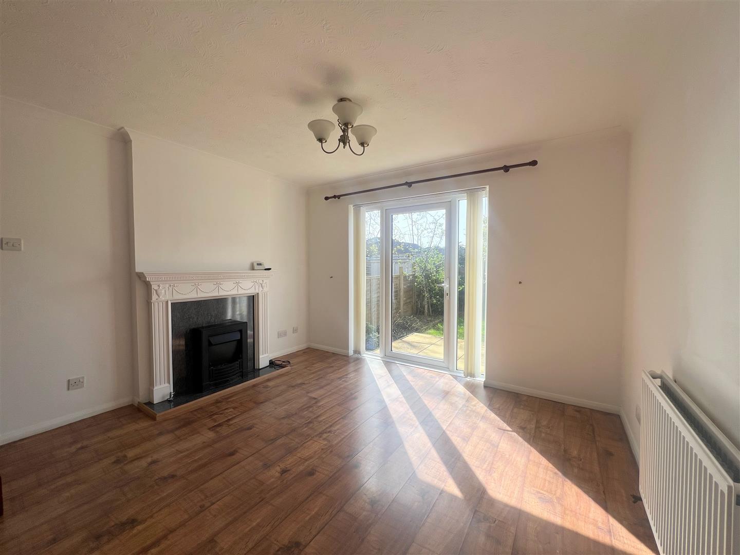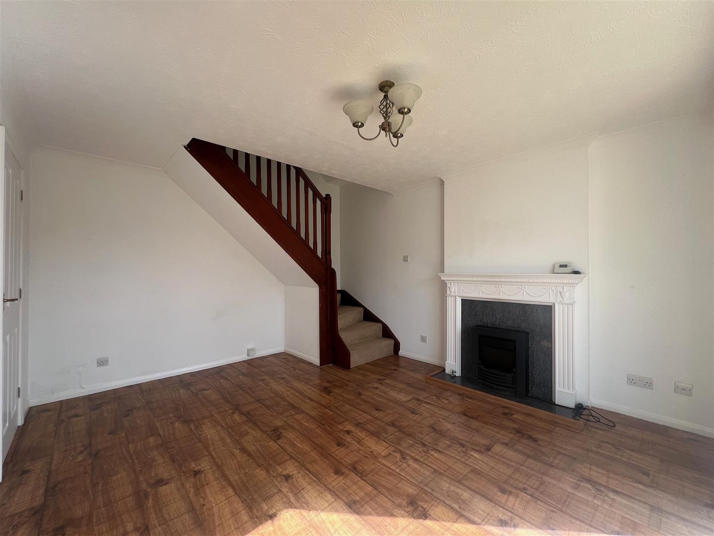 Electric fireplace set onto a stone-effect hearth and surround with wooden mantel. uPVC double-glazed patio door opening to the garden. Stairs ascending to the first floor landing.