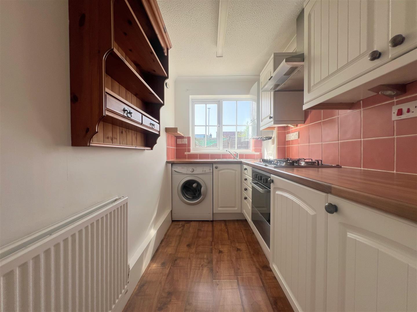 Fitted with a matching range of base and wall-mounted units incorporating a roll-edged wood-effect laminate worktop and an inset 4-burner gas hob with stainless-steel extractor over. Integrated oven. Space for washing machine. uPVC double-glazed window to the side elevation.