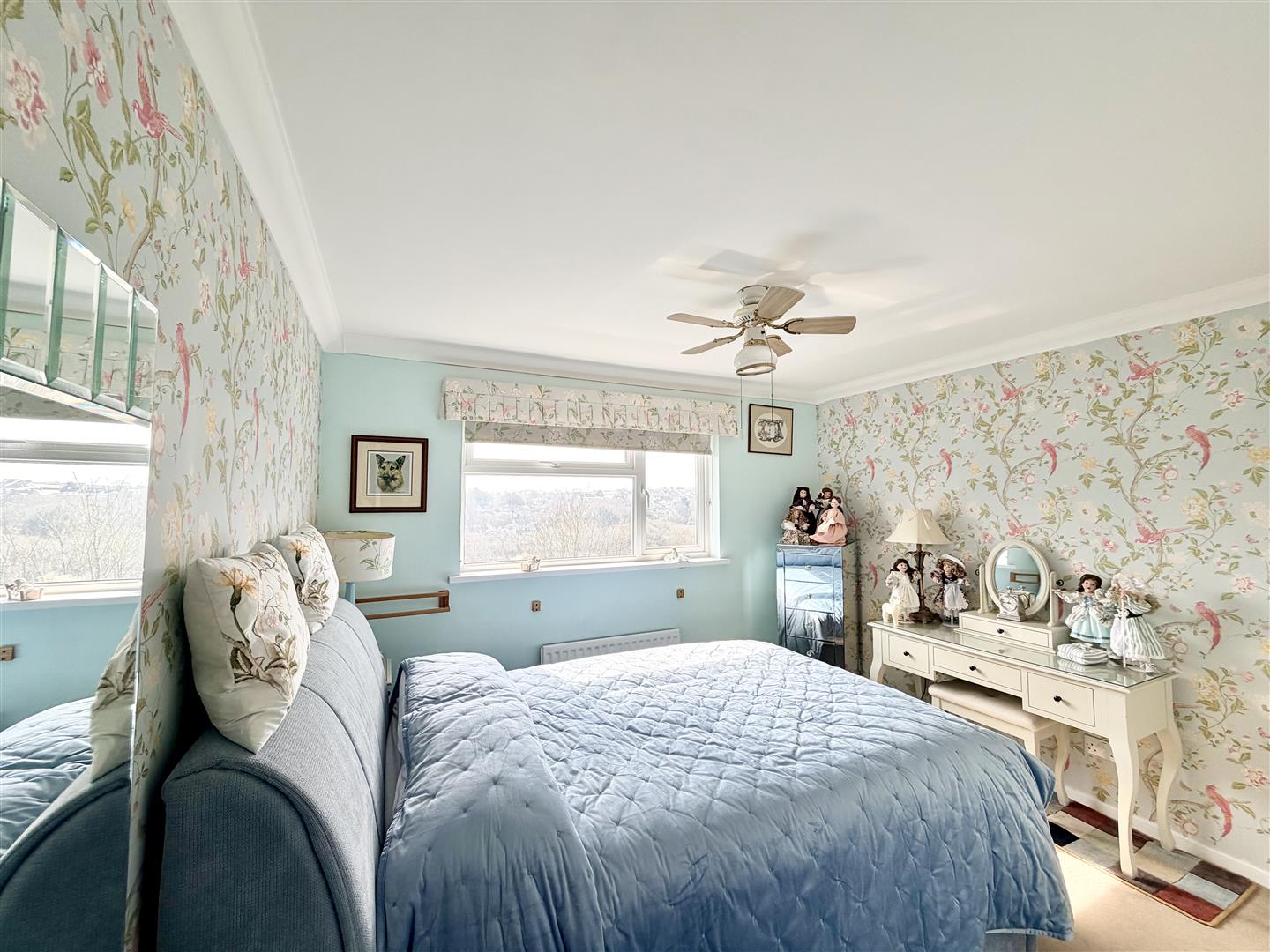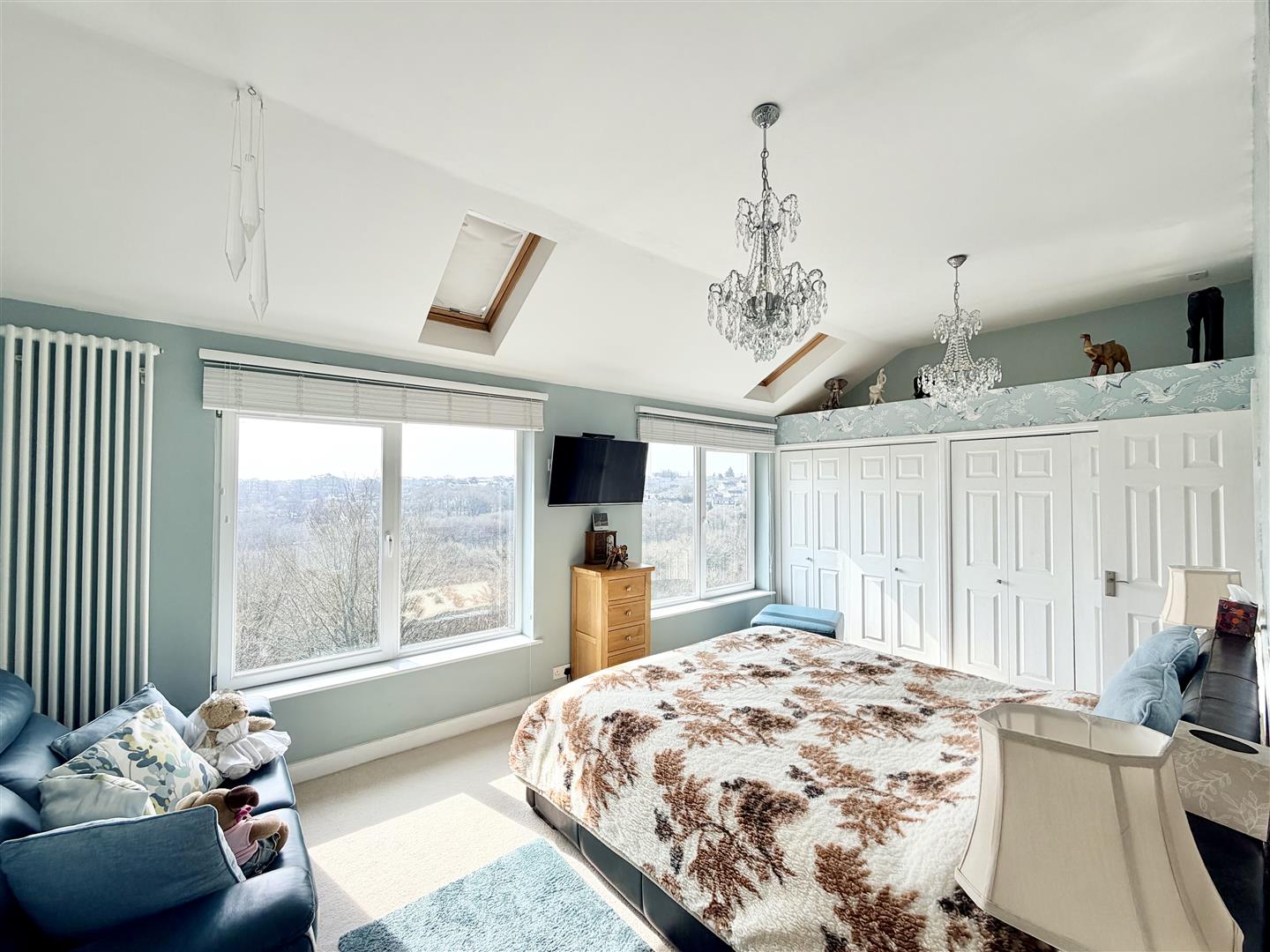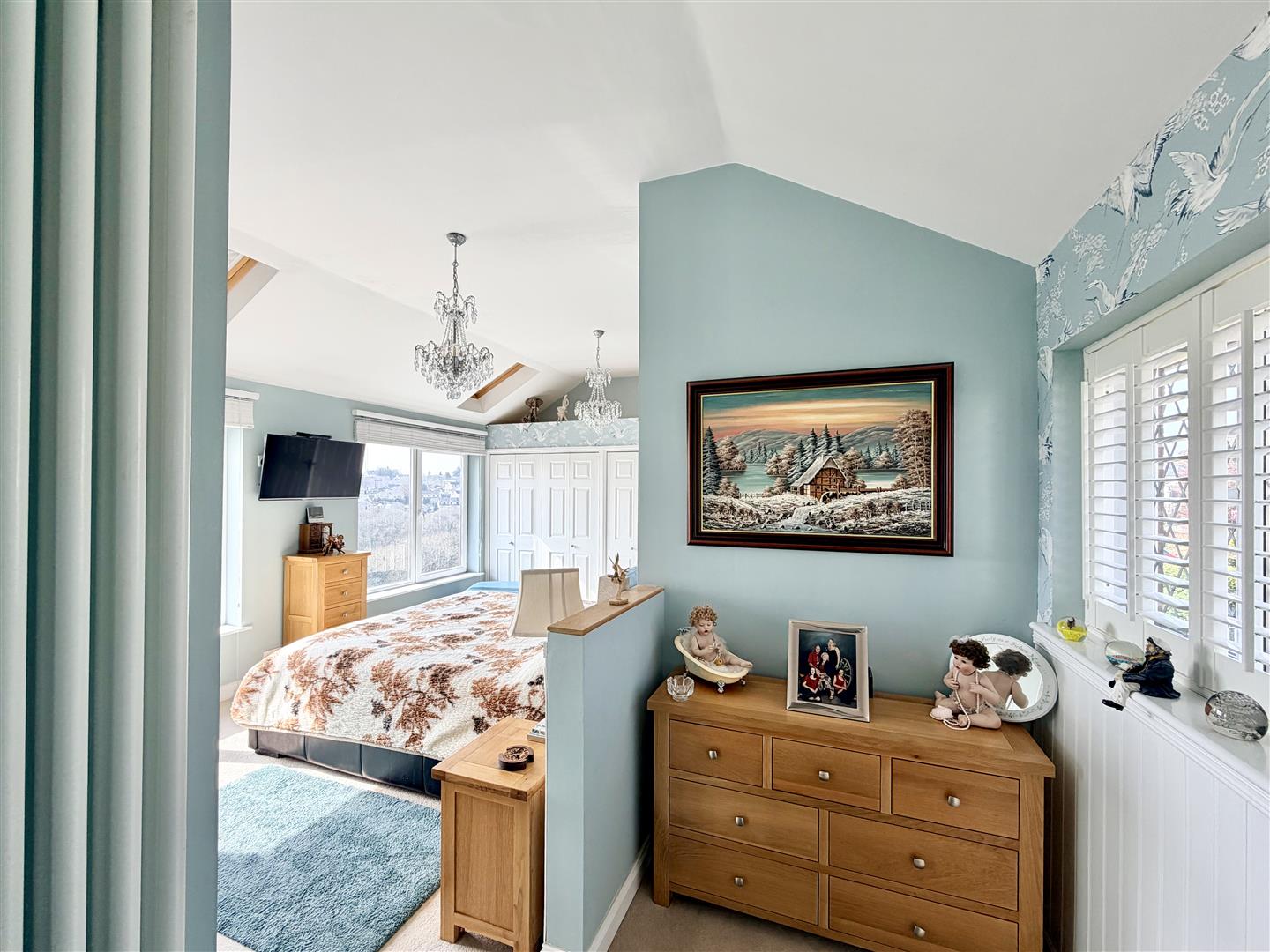 Two feet deep built-in wardrobes across one end. Two wide picture windows to the rear enjoying far reaching views. Door to;