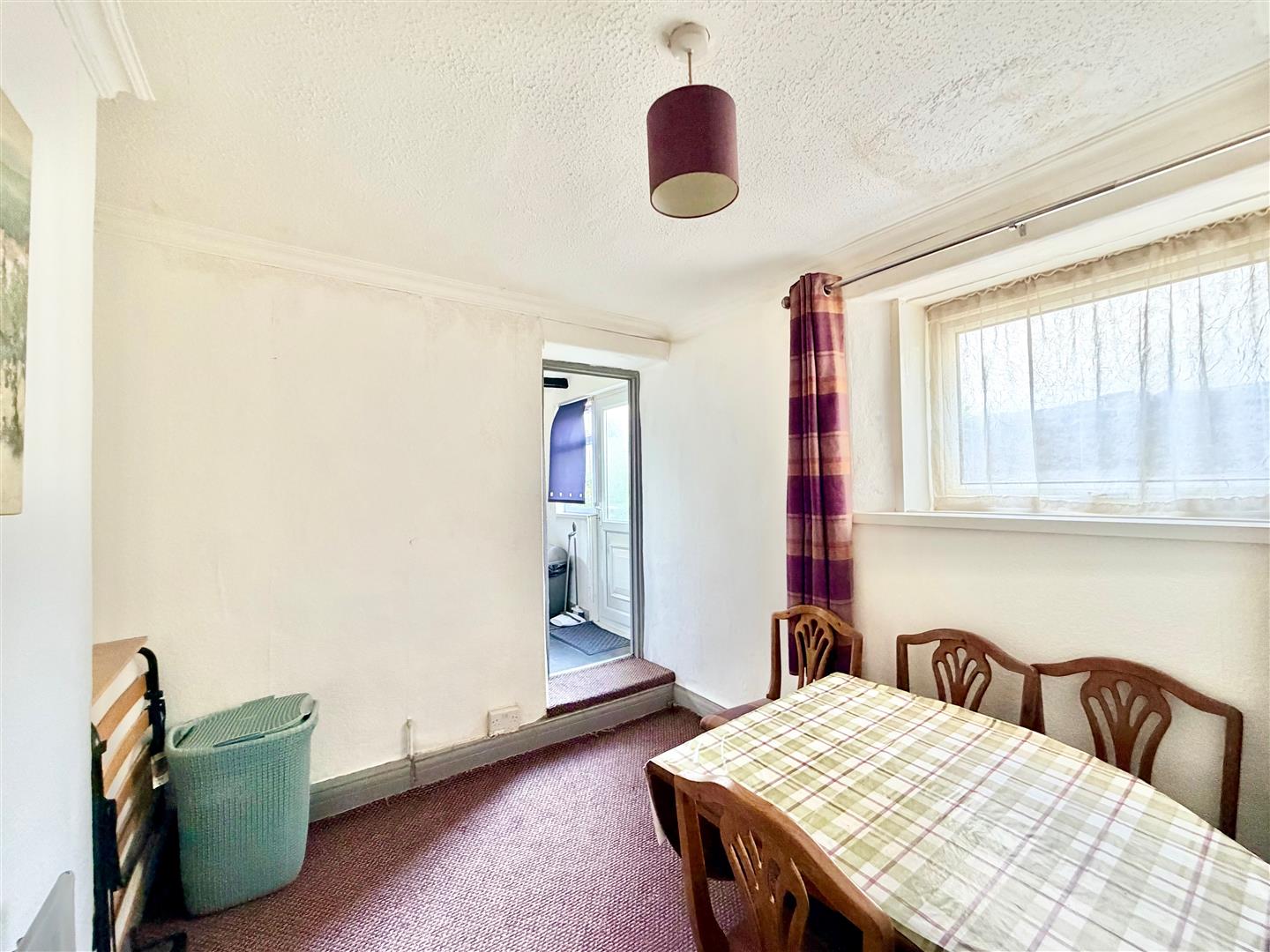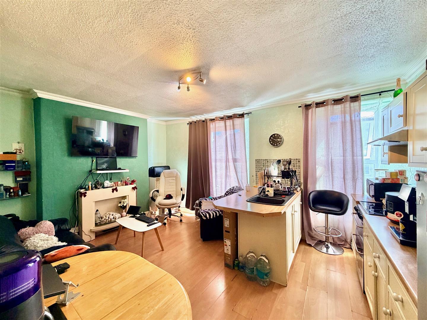 A full-width room situated to the front of the property with ample space for seating and dining. 2 windows to the front elevation. Chimney breast. Kitchen cabinets with matching work surfaces and tiled splash-backs. Space for free-standing appliances. Inset one-&-a-half bowl single drainer sink. Coved ceiling.